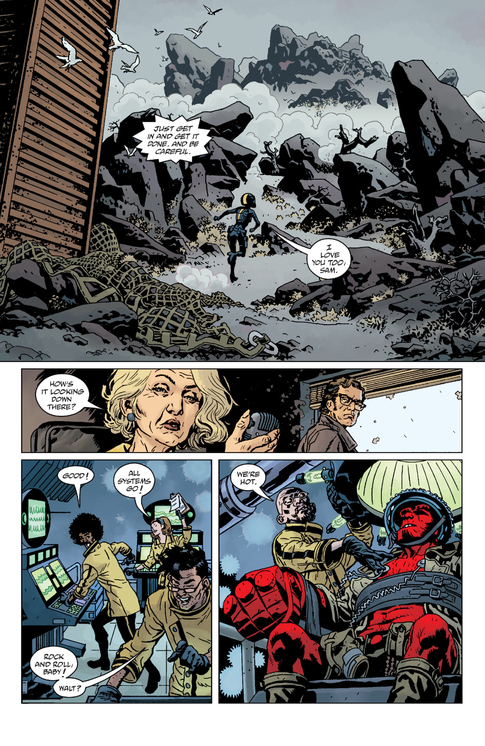 Duncan Fegredo: Do your readers like rocks? I drew a lot of rocks, real big ones, but they look rather smaller with the big metal guy stomping through them. If that isn’t enough then consider that our outsized protagonist is bound to run into various and equally large antagonists, they come in several flavors and they pack a punch. Mysteries to solve, disasters to avert, business as usual for Hellboy but at an unusual magnitude. What am I especially excited about? Right now that would be looking forward to seeing Dave Stewart's color for the third issue, because he really made the first two sing, I know he’ll bring the house down with the third.