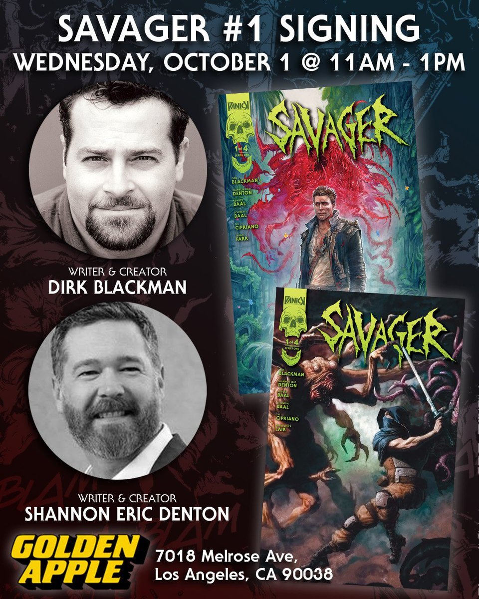 Savager #1 will be released this Wednesday, October 1st, so make sure to hit up your local comic book shop to check it out. To celebrate the release, writers Dirk Blackman and Shannon Denton will be signing at Golden Apple in Los Angeles! Come by Wednesday, October 1st, from 11 am - 1 pm to meet the talent behind PANICK's post-apocalyptic cosmic horror epic and get your signed copy!