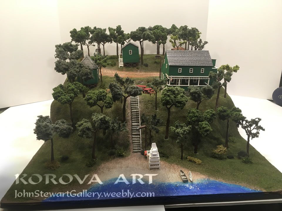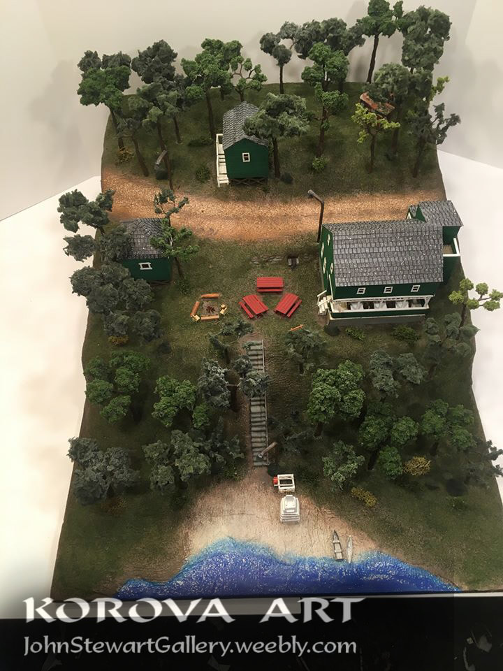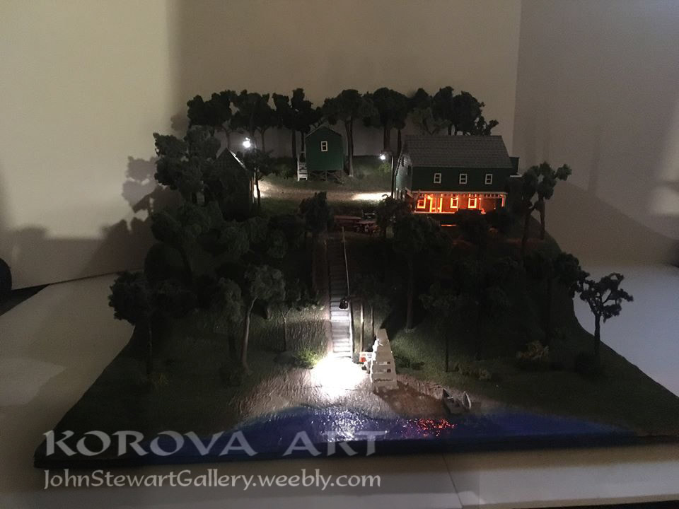 Built by artist John M. Stewart of Korova Art, the Packanack Lodge diorama brings the backdrop of Friday the 13th Part II to life with impeccable detail, from the campfire ring where we first see the new counselors in training and the massive lodge's porch where they gather for a good time to "sack head" Jason's ramshackle hideaway and the steep stairway leading down to the enigmatic waters of Crystal Lake.