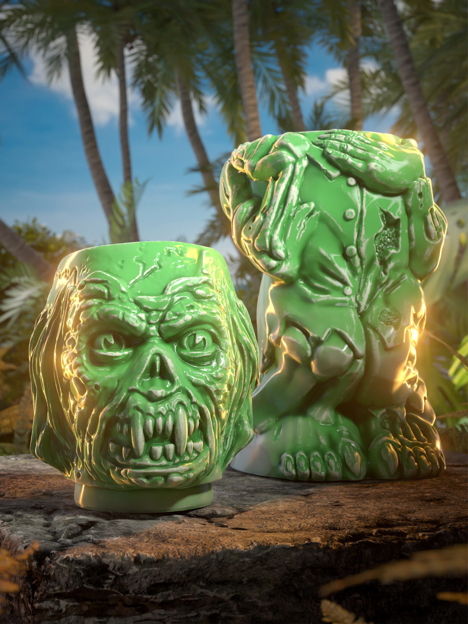 When stacked, The Beast of Blood Tiki mug is approximately 8" tall. Separated, the Beast's disembodied head holds approximately 4 ounces of fluid while the Beast's headless body holds approximately 8 ounces of liquid refreshment. More Beasts of Blood Tiki mugs will be coming soon to mix and mash up with their fellow Blood Islander and other Monster characters of Jungle Fantasy and Drive-in Horror fame.
