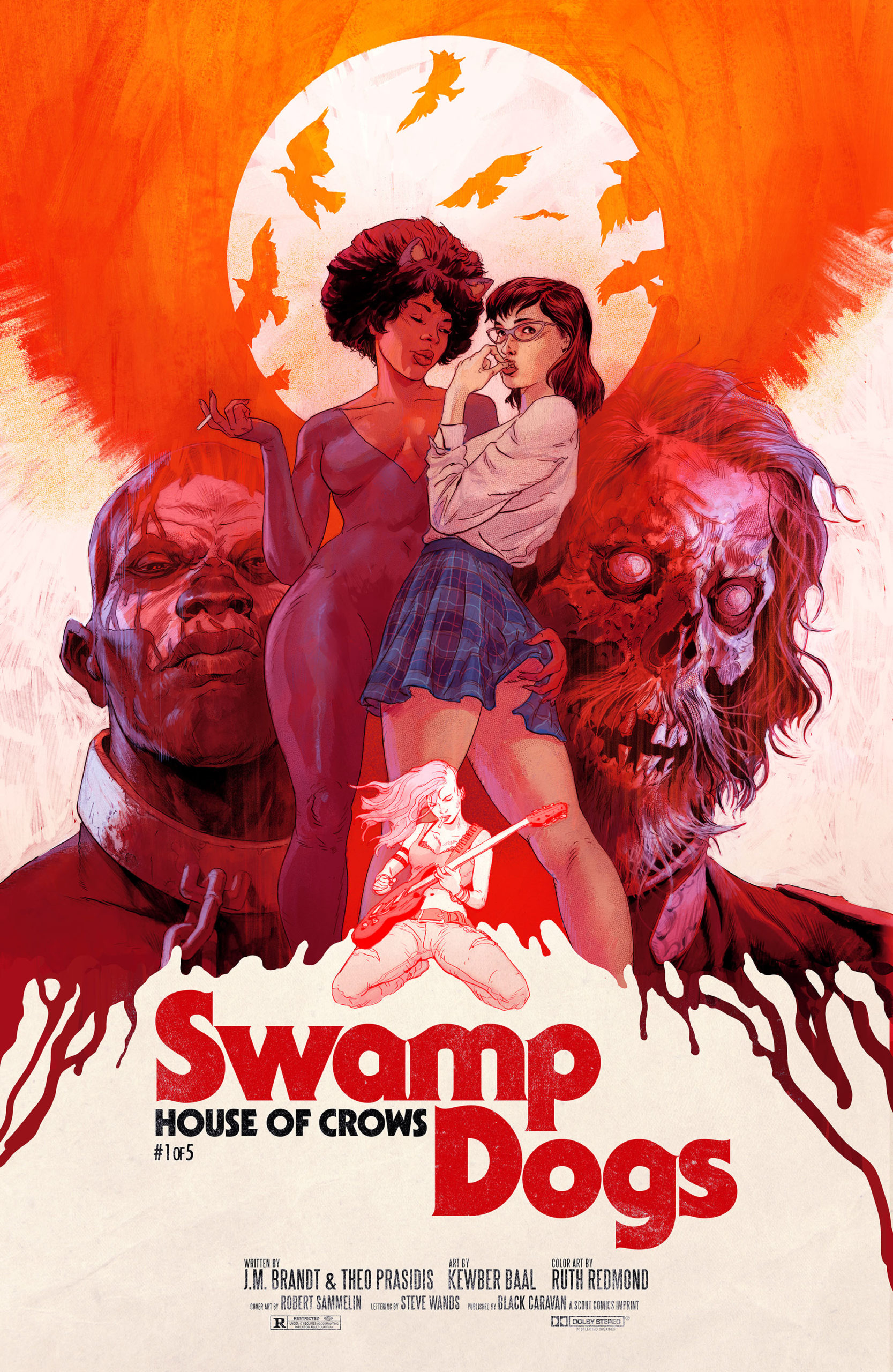 SWAMP DOGS: HOUSE OF CROWS will jumpstart the SWAMP DOGS universe. A 5 issue miniseries, it will introduce readers to the titular villains and the world which they are seeking to create. The book is a modern take that blends grindhouse, 70s and 80s horror, stoner comedies, cult classics, and midnight movies into one wild ride. The mini is a tight, funny, sexy, gory, horrific standalone story that is planned to lead into other ongoing titles, miniseries, and one-shots. It follows a budding lesbian couple and The Grunch, a goofy and fun-loving metal band, as they unwittingly stumble upon the SWAMP DOGS and their HOUSE OF CROWS. Co-writer Theo Prasidis explains, “A series of coincidences fulfill a Voodoo ritual that dates back to the Civil War and resurrects the most notorious and sadistic squad of the Confederacy, The SWAMP DOGS.” What results is a horrific bloodbath on the bayou as the SWAMP DOGS stretch their legs-- getting ready to conquer Louisiana, and then everything else.