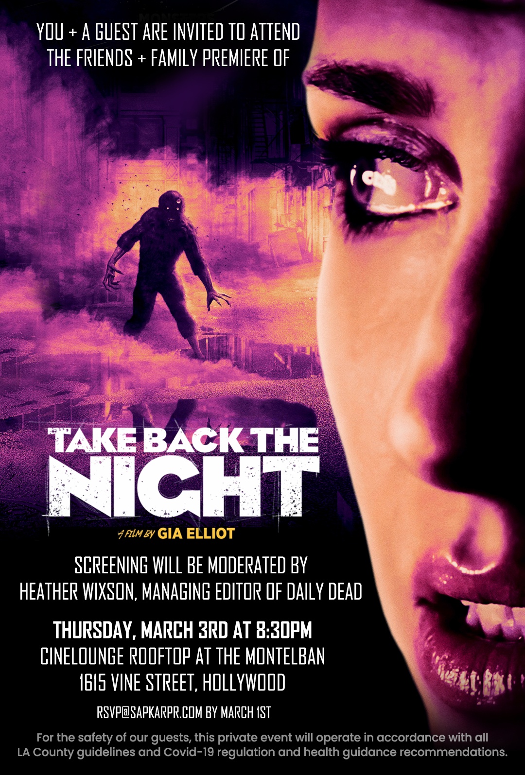 To celebrate the film's March 4th theatrical and digital release from Dark Sky Films, Daily Dead Managing Editor and Monsters, Makeup & Effects: Volume 1 author Heather Wixson will be hosting a special screening and Q&A for Take Back the Night at 8:30pm on Thursday, March 3rd, at the Cinelounge Rooftop at The Montalbán theatre in Hollywood!