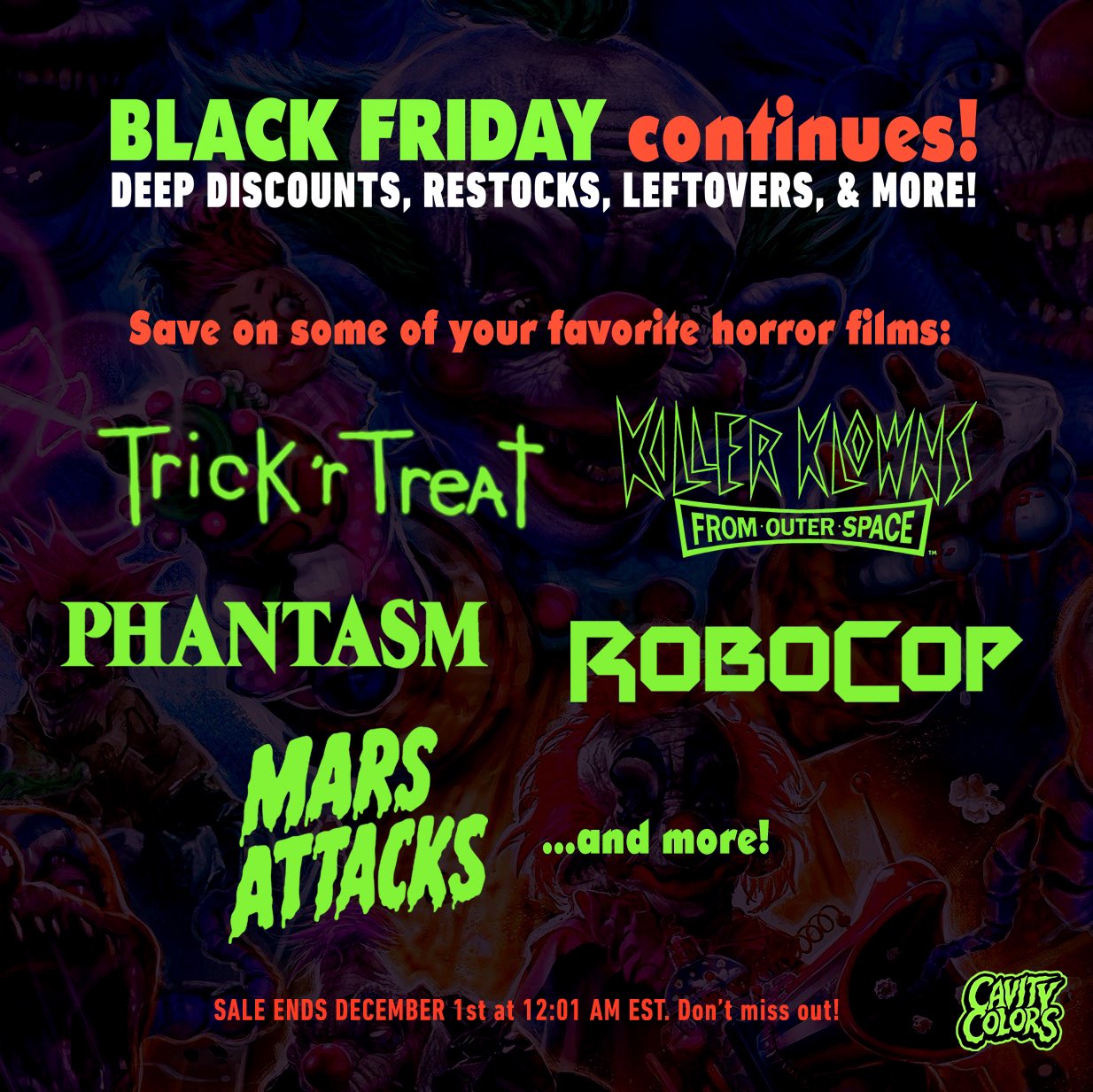 Last week, we gave you the skinny on a ton of horror-related sites that were having Black Friday deals, and here’s a quick look at the sites that are still offering up discounts through today: