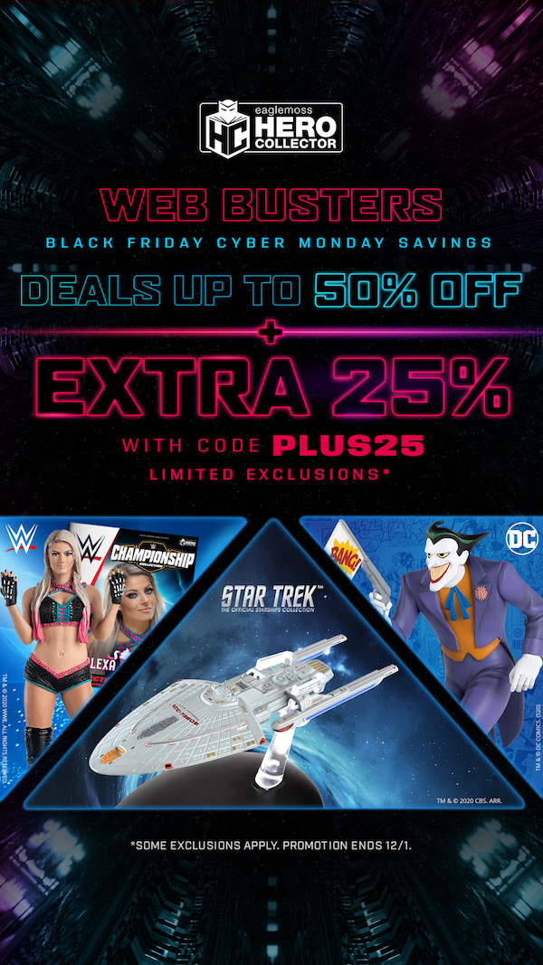 Eaglemoss: Eaglemoss features a ton of great sci-fi collectibles that would make for perfect gifts this holiday season, and currently they have a great Black Friday sale going on. To earn an extra 25% off your order, use the code PLUS25 at checkout. To see what Eaglemoss has to offer, check out their online store at: https://shop.eaglemoss.com/us/.