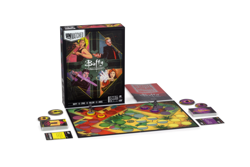 Unmatched: Buffy the Vampire Slayer features four heroes. Buffy will hit you with Mr. Pointy or summon her Slayer’s strength for a cartwheel kick. When it’s time for backup, she’ll take her pick between insightful Giles or reliable Xander. Spike, a relentless hunter, seeks the shadows and calls on Drusilla’s Sight to let him know just where and when to strike. Willow, a peerless witch, dabbles in black magic and risks her darker self, potent but dangerous. At times, only Tara can bring her back from the brink of the abyss. Angel, once the Scourge of Europe, is cursed with a soul, conflicted by his victories and taking solace in his losses. Faith is there to make sure things stay “Five by Five”.