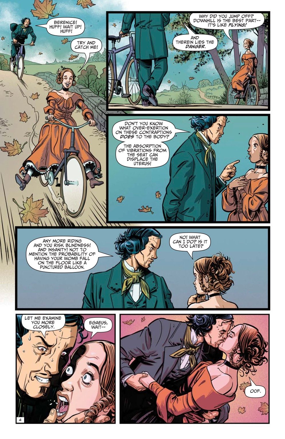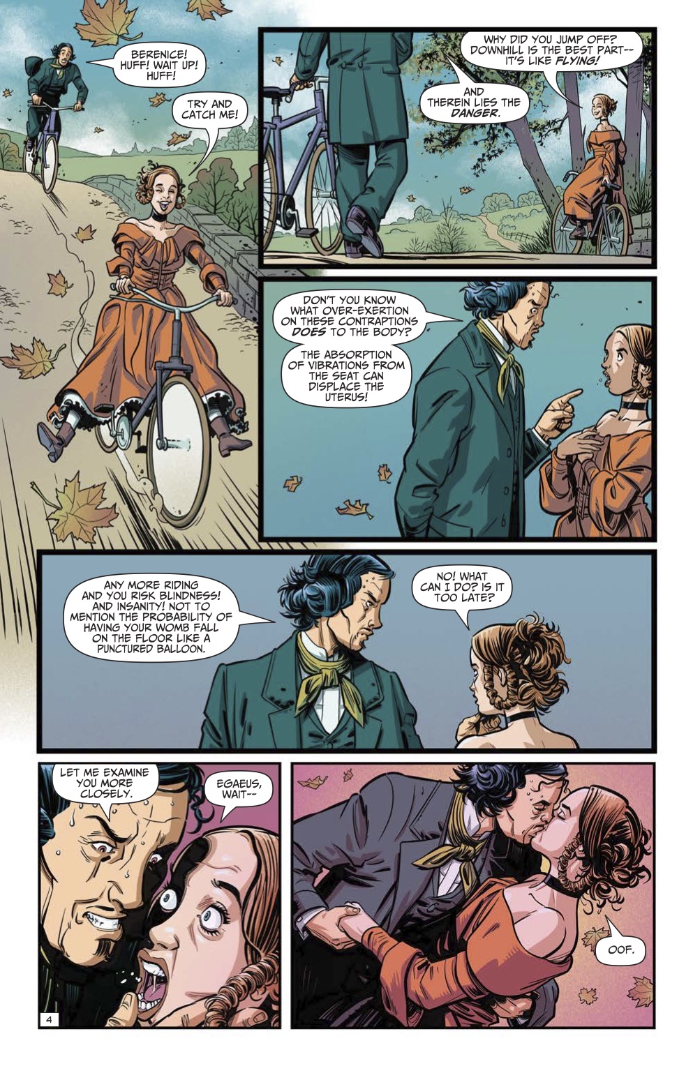 "Let's face it, there's something creepy about teeth. After all, they're the only part of our skeletal system that isn't discreetly covered by a bit of flesh. Jung believed that dreams of losing one's teeth were related to life transitions. This may have been connected to the old idea that every time a woman gives birth to a live baby, she loses a tooth. If all this talk of birth and teeth has you feeling a bit uncomfortable, you're not alone--there are numerous folk tales from various different cultures that center around the uncomfortable idea that women's dentition is not the same as men's. Which brings me back to Poe's story, Berenice. I have no idea why this hymn to hypochondriacal passion isn't better known, because this is definitely one of Poe's more unsettling tales. It's also a story which makes me feel a little squicky as a woman and a feminist. I decided to turn that squick on its head, as it were. I also did my research--all the insane theories about bicycle riding, which are not in the original tale, are based on medical beliefs of the time. I even included cameos by the actual proponents of the theory, and Alain Mauricet drew them in as guests in the opening panels. (They are Dr. Arabella Kenealy, (a stout, short, curly haired, bespectacled woman), and Dr. Arthur Shadwell, (a tall, thin, beak nosed gentleman with a receding hairline). Feel free to do your own research into that dreaded scourge of female health and chastity--the bicycle."