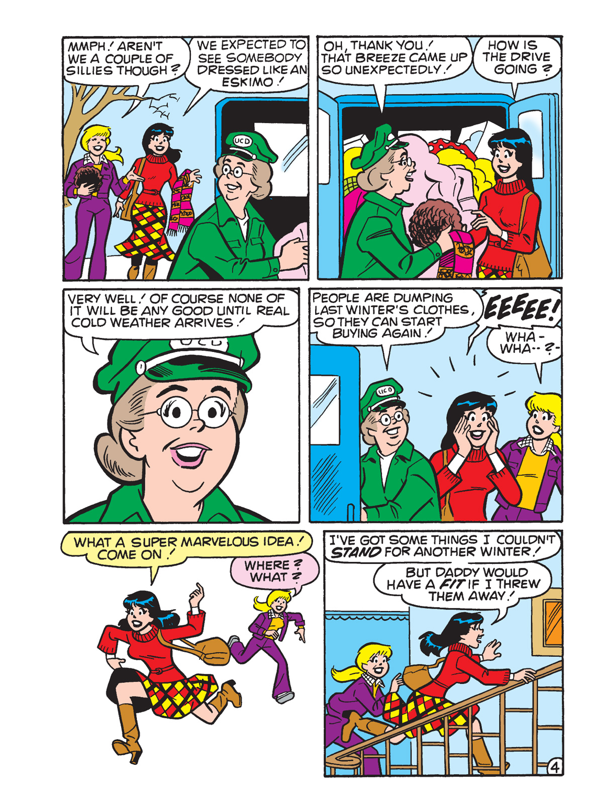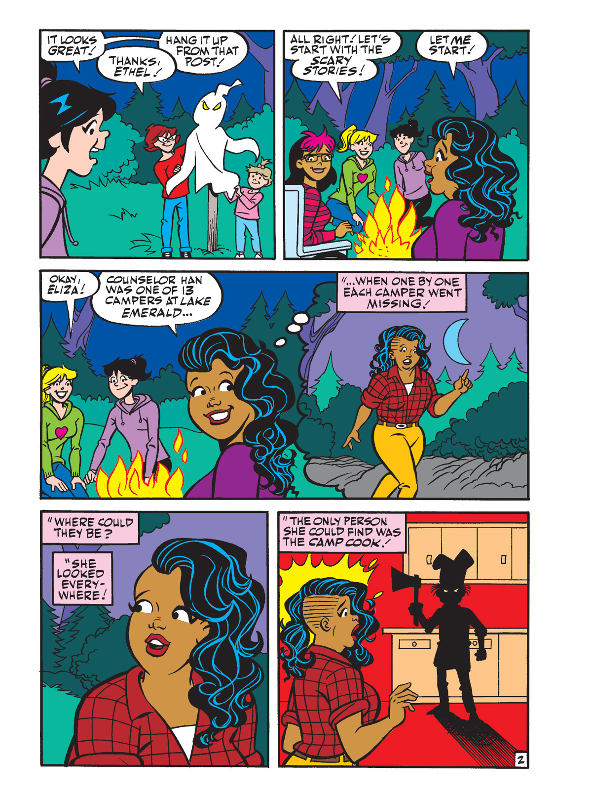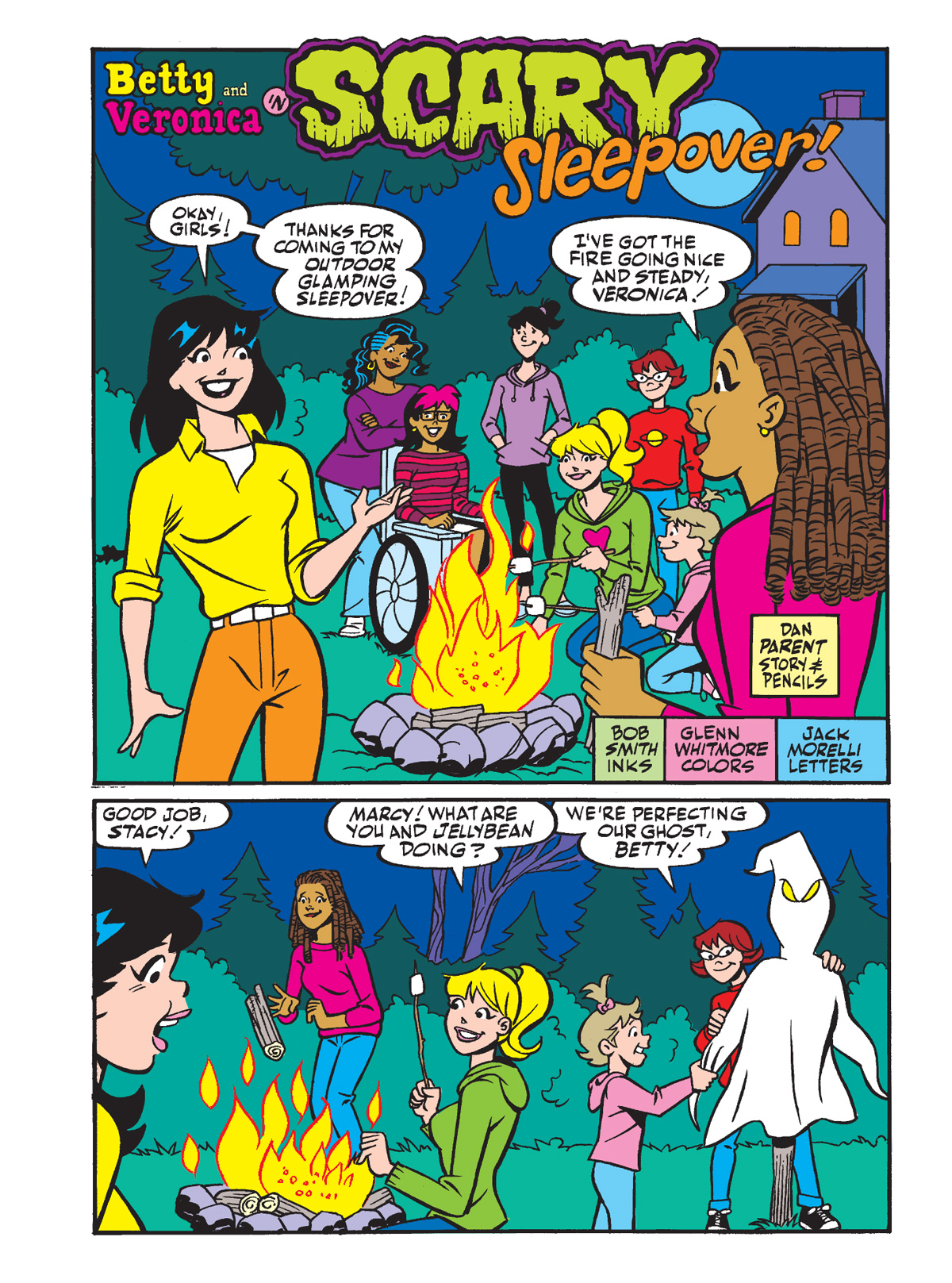In this week's exclusive preview of Betty & Veronica Jumbo Comics Digest #308, Eliza tells a creepy story around the campfire at Veronica's "Scary Sleepover." As an additional treat, we have another Archie Comics Halloween story in its entirety, in which a strong autumn breeze inspires Betty and Veronica to donate to the local clothing drive!