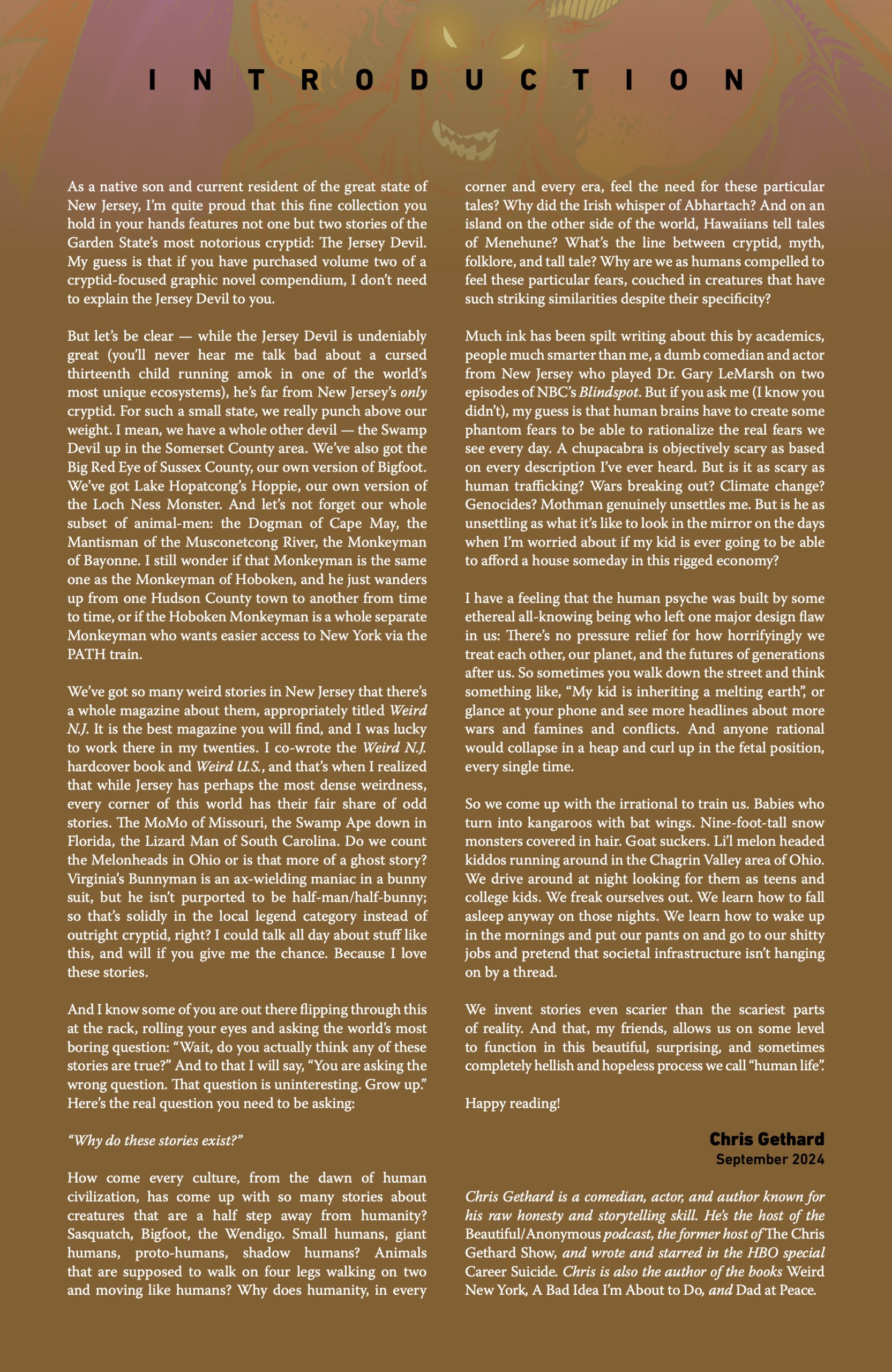 As a special treat for Daily Dead readers, we have an exclusive reveal of the second volume's introduction by comedian, actor, and author Chris Gethard, who reminds us that while his home state of New Jersey is home to a plethora of peculiar cryptids, "every corner of this world has their fair share of odd stories," whether it's South Carolina's Lizard Man, the Bunnyman of Virginia, or the Dogman of Cape May.