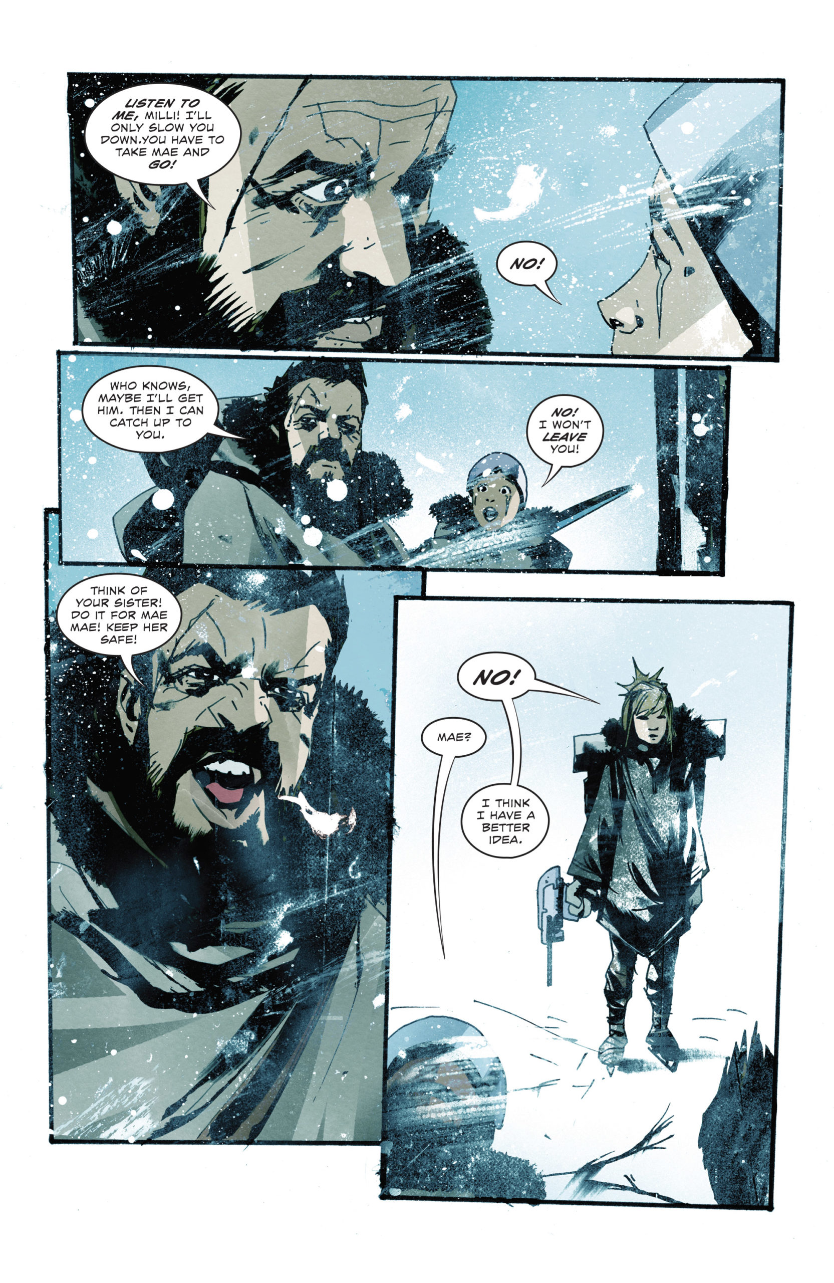 Milli and Mae don’t really know how their people came to live here. No one does, not even their wise and gentle father. On Milliken’s twelfth birthday, their father takes the two girls on an overnight skate down the trench — a coming-of-age ritual to teach them how to fish the frozen river, how to hunt the wild Trenchdogs that wander its frigid banks, and how to give proper thanks to their frozen Gods — The Colden Ones. It’s the trip of a lifetime until the girls push beyond the borders of their humble land and awaken the Trench’s deadly defender…The Snowman!