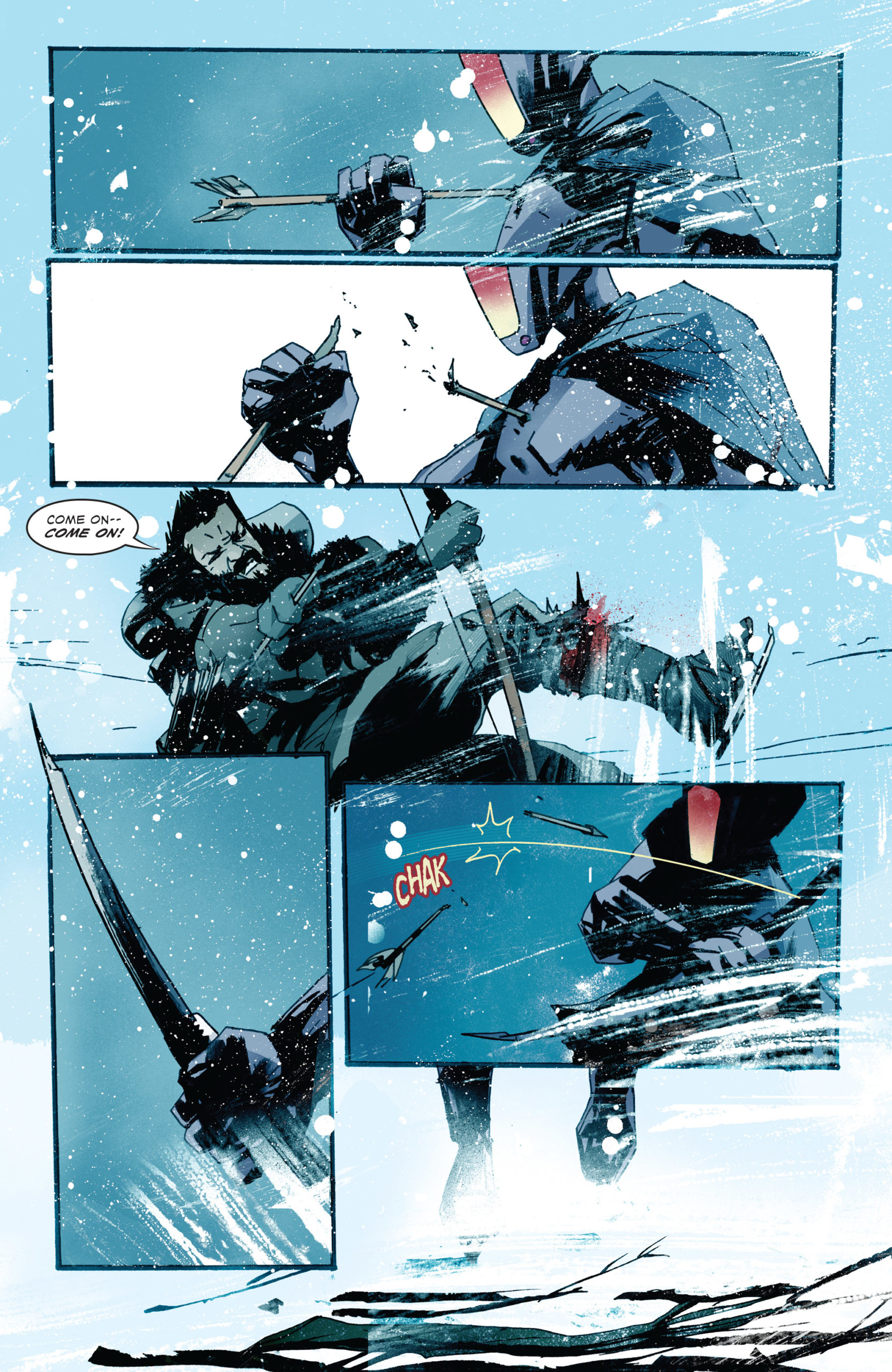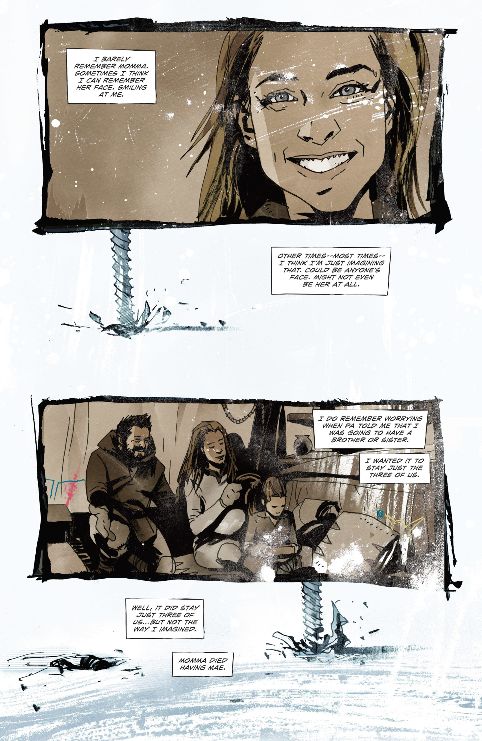 "You must never leave The Trench. The Trench provides. The Trench is endless." These are the three rules the arctic survivors known as The Trenchfolk must abide by to survive and please their Gods known as The Colden Ones in Jeff Lemire and Jock's comic book series Snow Angels. A comiXology Originals series, the third issue of Snow Angels will be released digitally on April 20th, and we're thrilled (and chilled) to exclusively reveal the cover and preview pages from the upcoming issue ahead of its release!