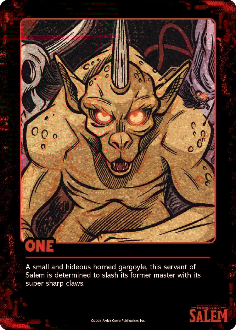 In our exclusive look at the trading cards, you can meet a horned gargoyle, an undead minotaur, and a bat-like horror that all share the common goal of hunting down the Spellmans' feline familiar!
