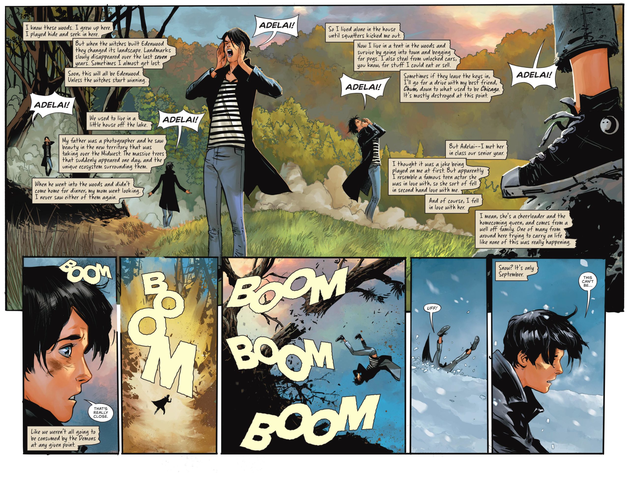Edenwood—An eons-long series of multiverse wars between demons and witches has found earth as its latest battleground. The battle pits Necronema, the demonic land which supplanted the Midwest twenty years ago, against Edenwood, the witchcraft controlled area of land that protects the rest of the U.S. In the first story arc of this ongoing series readers are introduced to Rion, a young man born during the apocalyptic events of southern Illinois, who is thrust into the role of hero and leader after killing a Gather, a transient demon with the powers to cross any barrier or dimension.