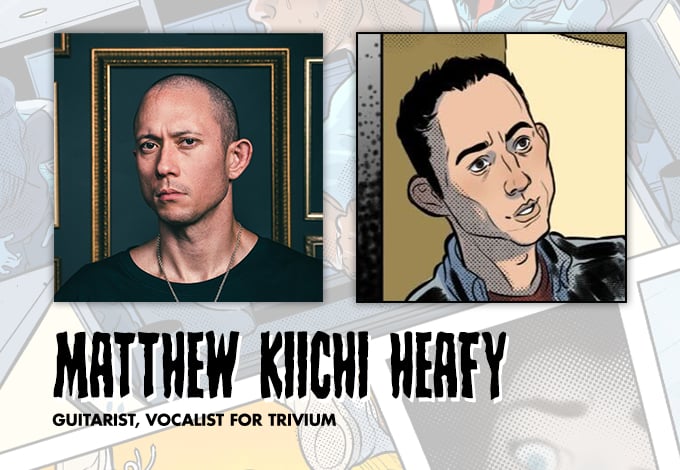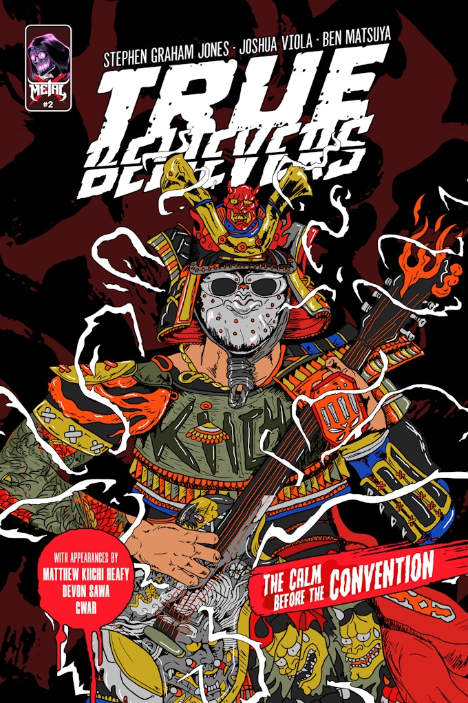 After introducing readers to the masked convention slasher known as Killr™ last fall, Stephen Graham Jones, Joshua Viola, and Ben Matsuya are teaming up to bring readers back to the Colorado Festival of Horror for another round of killer cosplay in True Believers #2. Once again featuring star-studded cameos and plenty of murderous mayhem, True Believers #2 is coming soon to Kickstarter via Hex Publishers, and we're thrilled to exclusively reveal that Trivium vocalist and guitarist Matthew Kiichi Heafy will appear in the second issue, and we also have a reveal of the new variant cover by Luigi Scarcella!