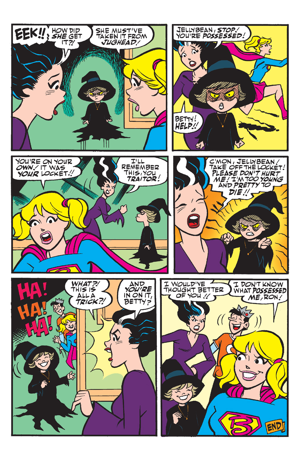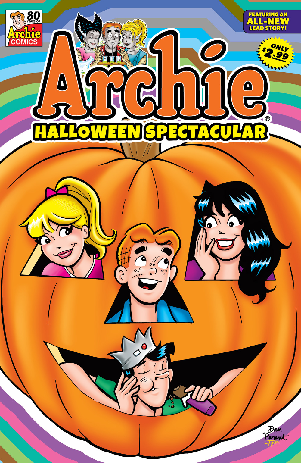 We’re kicking off this hauntingly hilarious collection of Archie tales with a BRAND NEW STORY! In “Pumpkin Problem-o,” when Archie unknowingly rebuffs a witch friend of Sabrina’s he wakes up Halloween morning with a Jack-o-lantern head complete with the cross hatching on the side! Even worse, he can’t convince anyone it’s real and not a costume! Will our pumpkin-headed friend turn back to a teen before midnight—or will he forever be stuck as an Arch-o-lantern? All that and more in this frightfully fun Halloween special!