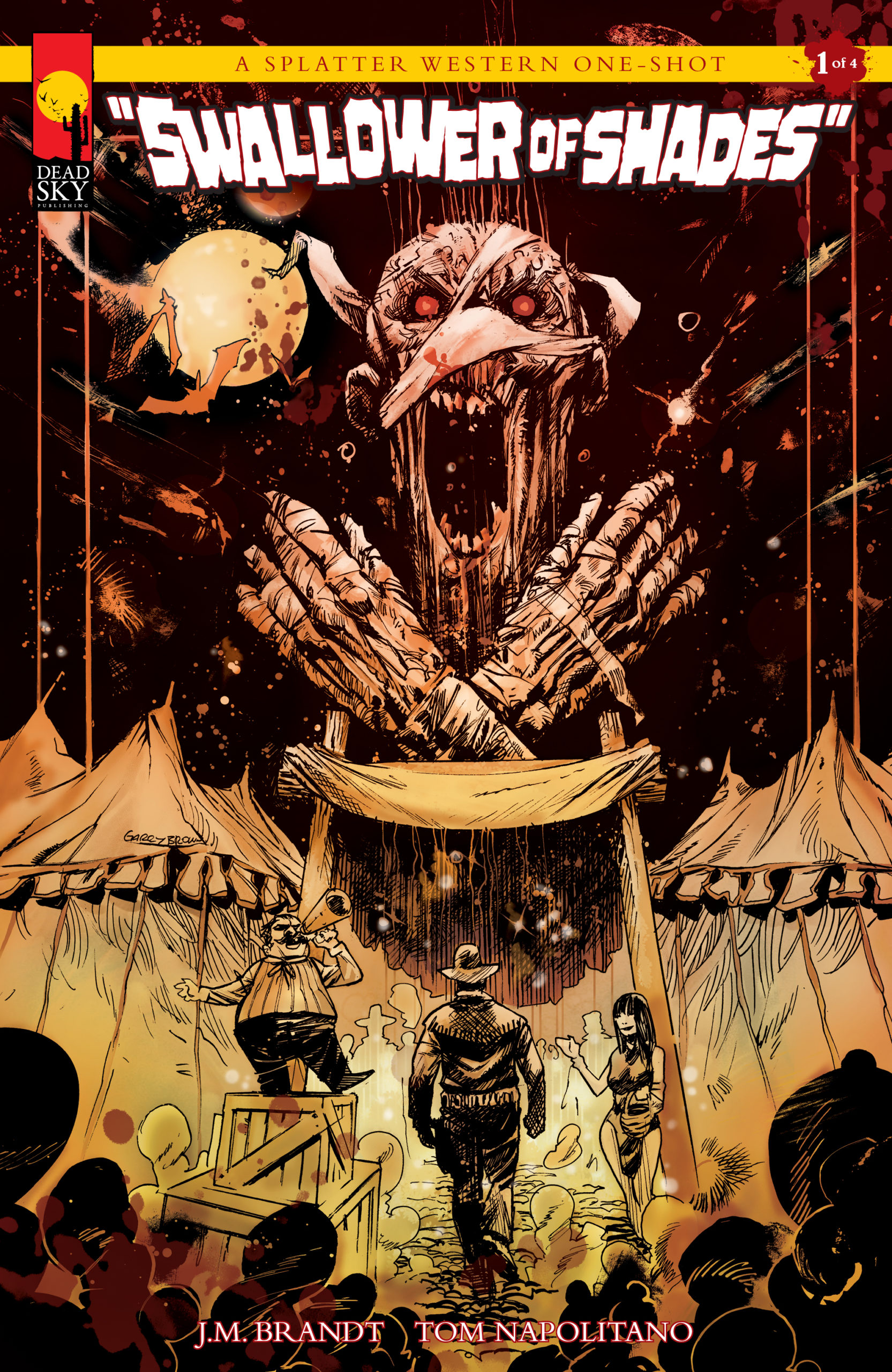 Swallower of Shades is the first of a 4-book splatter western one-shot series with creative teams that include Scott Bryan Wilson and Robert Gaughran, R.K. Latch and Arjuna Susini, J.M. Brandt and Tom Napolitano, and Michelle Garza and Dan Franco. With all books featuring cover art from Garry Brown, we have a reveal of the cover and exclusive preview pages from J.M. Brandt and Tom Napolitano's Swallower of Shades: