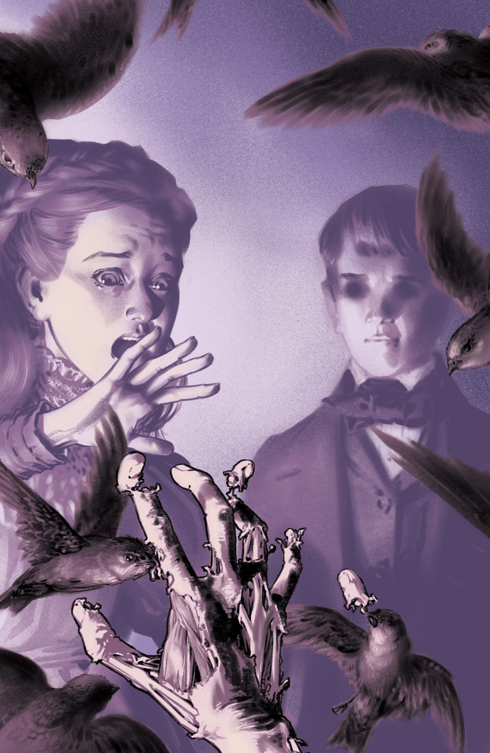 Kelley: I was inspired by the fiction of M.R. James, J.S. Le Fanu, and Wilkie Collins. Classic Bray Studio era Hammer films. ITV Granada’s seminal and definitive Sherlock Holmes series, to be sure. And everything dear Bernie Wrightson did in the ’70s for DC’s horror anthologies. I actually pictured Laura as a young girl for Daphne.