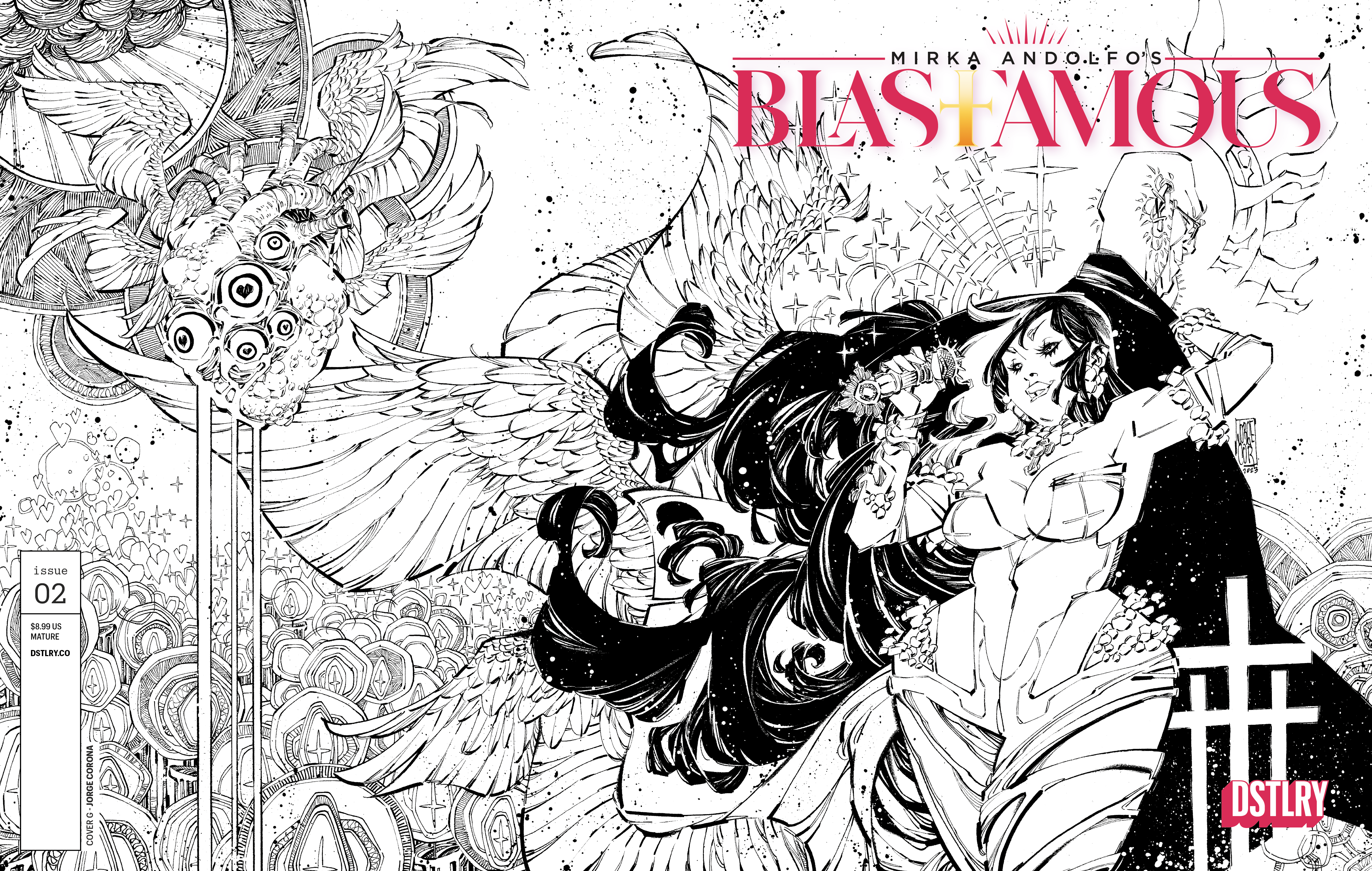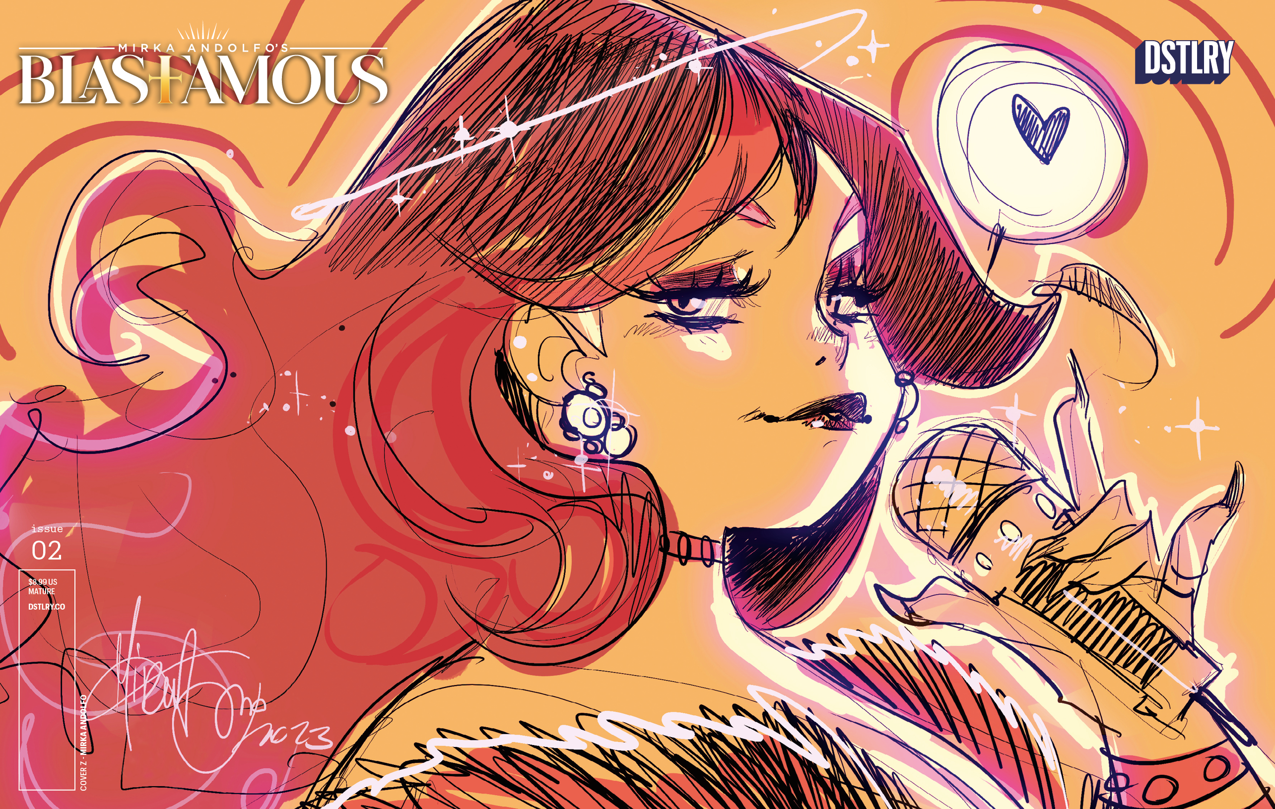 BLASFAMOUS #2 is written, drawn, and colored by Harvey Award-winning writer and artist Mirka Andolfo (Sweet Paprika, Unnatural, Mercy). Website-exclusive variant covers include offerings from Jorge Corona (Batgirls, Transformers), Sweeney Boo (Harley Quinn, Eat, and Love Yourself), and Mirka Andolfo’s live draw cover from her San Diego Comic-Con panel last year.
