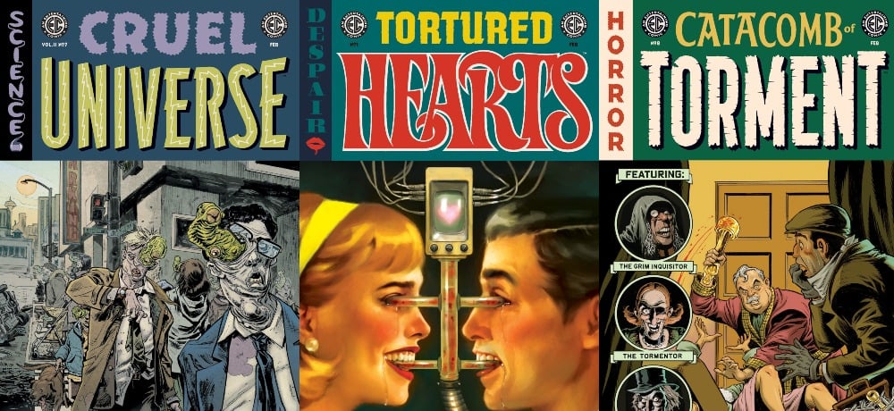 After delivering thrills and chills all year long on the paneled page, EC Comics and Oni Press will still have plenty of frightful fun for readers to lay their eyes upon in the dawn of the new year, and as a terrifying treat for Daily Dead readers, we have a look at the eye-catching (and eye-gouging) covers and deadly details for Cruel Universe 2 #7, the Valentine's Day special Tortured Hearts #1, and the blood-splattered Catacomb of Torment #8!