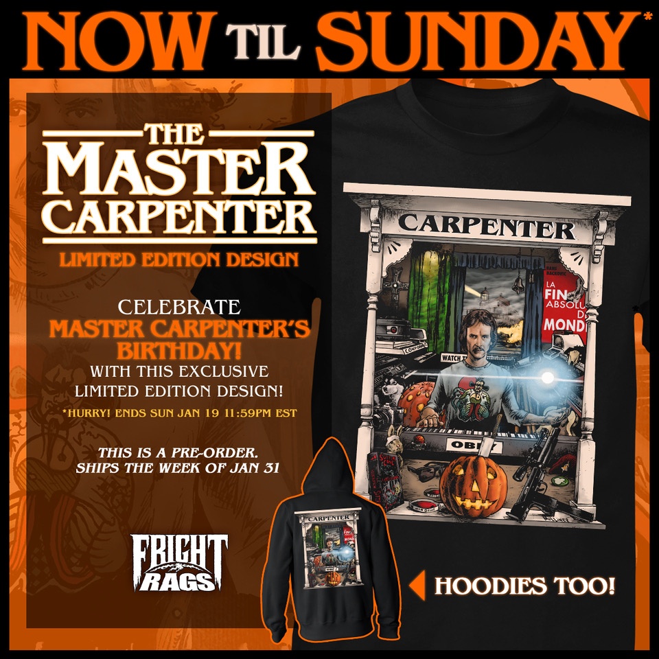 Today marks the birthday of Master of Horror John Carpenter, and Fright-Rags is honoring the influential and endlessly imaginative director, writer, and composer with a limited edition shirt design that is available through the weekend.