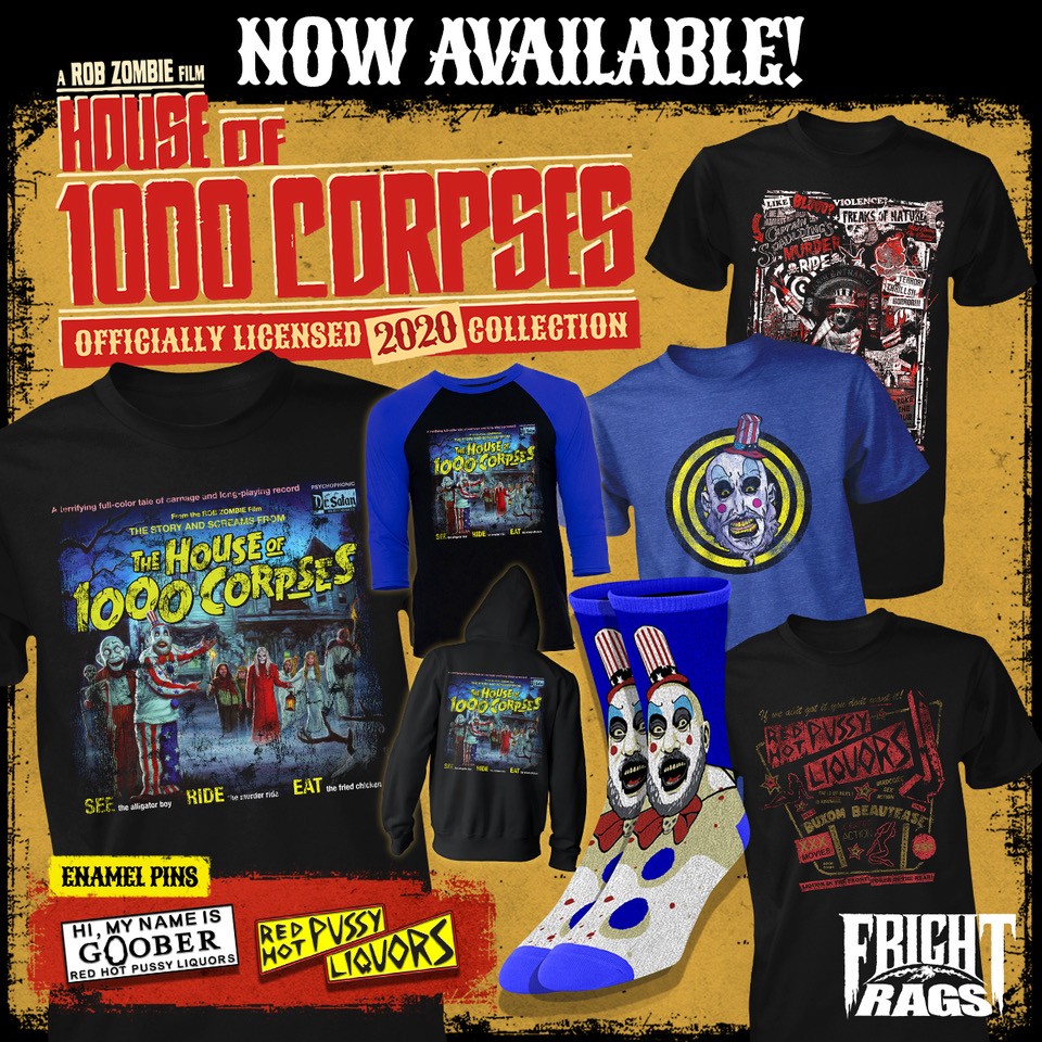 Fright-Rags' House of 1000 Corpses collection features three new designs, including a Haunted Mansion-style album cover and a tribute to the late Sid Haig's iconic role as Captain Spaulding. Rob Zombie's directorial debut has also received two enamel pins, a classic shirt reprint, and Captain Spaulding socks.