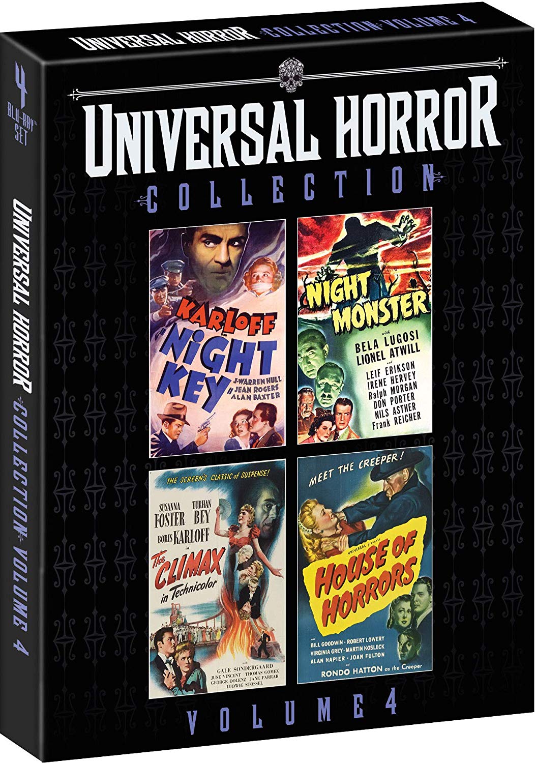 Volume 4 includes four tales of terror from the archives of Universal Pictures, the true home of classic horror. This collection includes such horror stars as Boris Karloff, Bela Lugosi, Lionel Atwill, and Rondo Hatton. Boris Karloff ignites the screen as an inventor who is kidnapped by a gang of burglars and forced to help them commit robberies in Night Key. Bela Lugosi stars in a creepy tale of strange characters, secret passages and a murderer who masters the art of “mind over matter” in Night Monster. In The Climax, Karloff is terrifying as a mad doctor whose insane jealousy over a beautiful opera singer may drive him to murder. A giant of a man is used as an instrument of evil by a mad sculptor in House of Horrors.