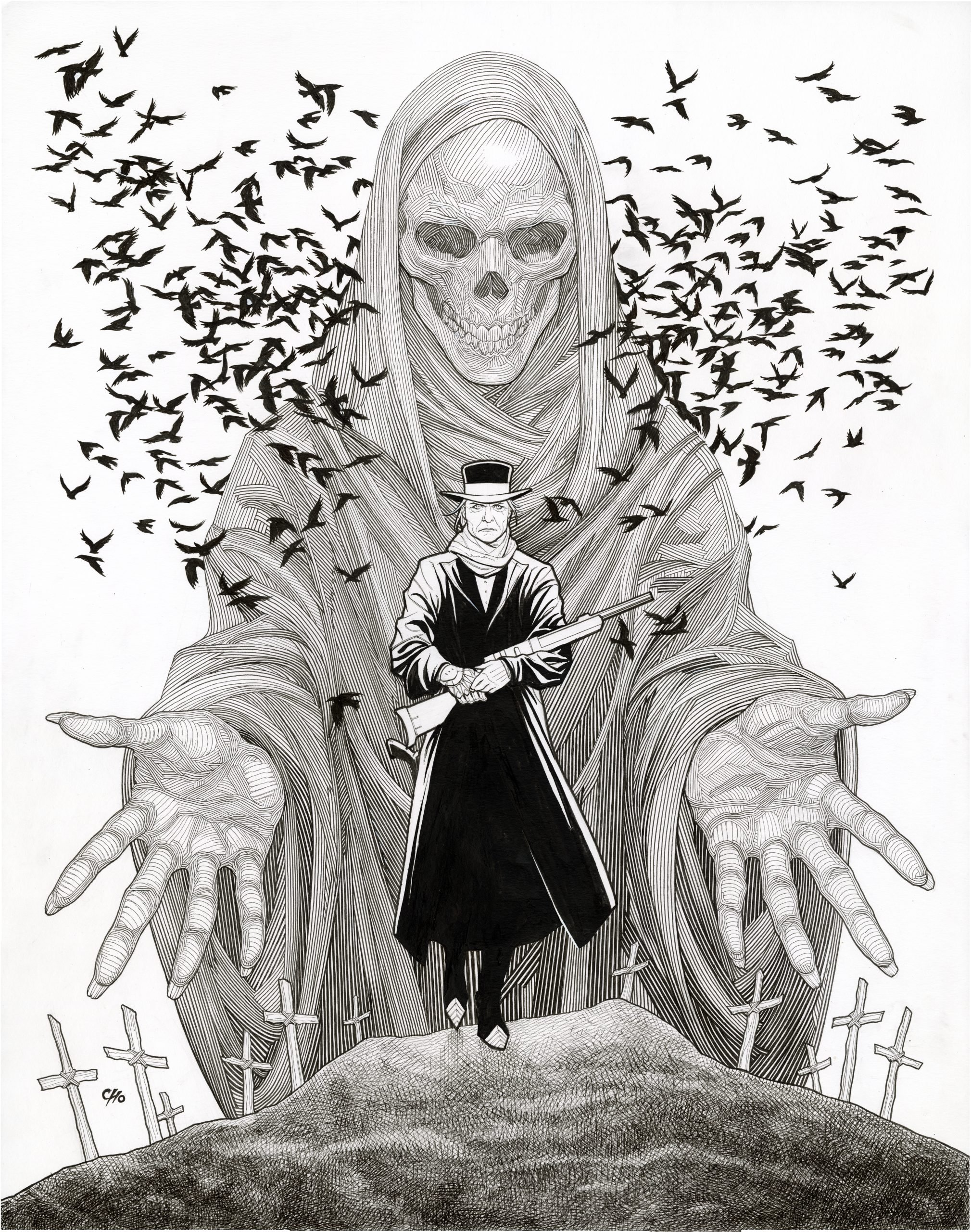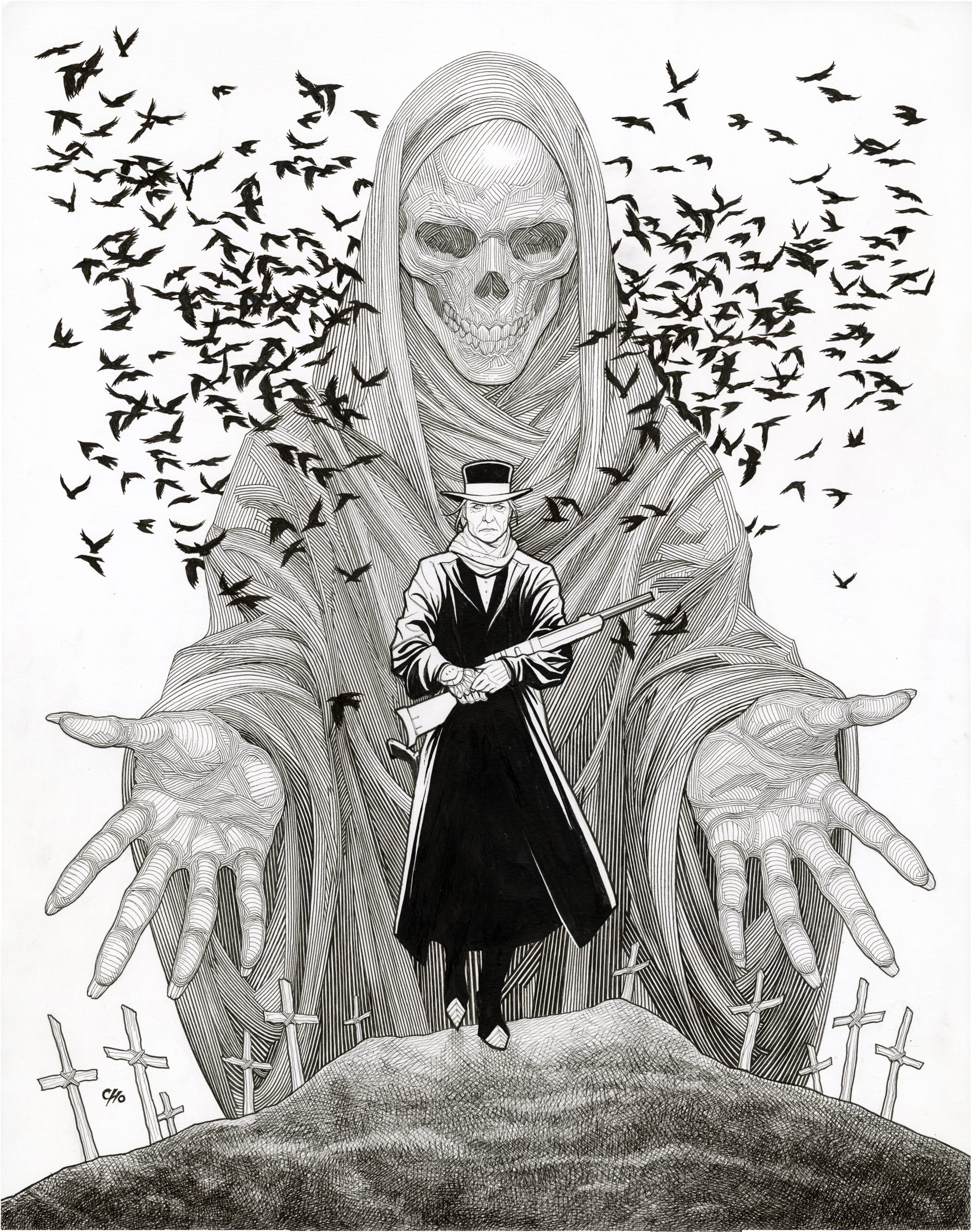 Of particular note is Cho’s extraordinary crosshatching technique which is a meticulous practice that reveals his reverence for traditional methods. Through dense lines and tonal precision, he creates works that feel sculpted from ink, each figure rendered with volume, weight, and palpable energy. His technical mastery brings to mind the classic illustrators of the early 20th century, while reimagining their sensibilities for the modern era.