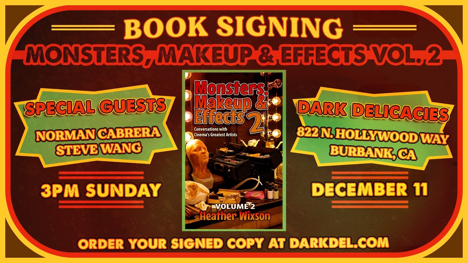 The Monsters, Makeup & Effects: Volume 2 book signing will take place this Sunday, December 11th at 3:00pm PT at Dark Delicacies, featuring Heather and special guests Steve Wang and Norman Cabrera, who are both featured in Monsters, Makeup & Effects: Volume 2!