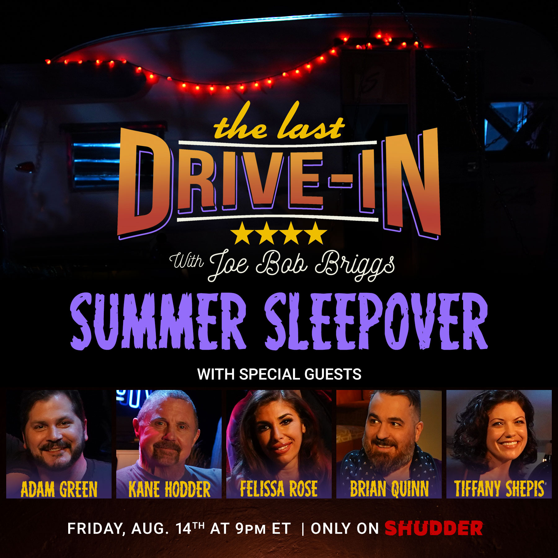 Adam Green, Kane Hodder, Brian Quinn, Felissa Rose and Tiffany Shepis join Joe Bob Briggs for ‘The Last Drive-In’ Summer Sleepover: "August 10, 2020 — it’s a full house at the trailer park as director Adam Green (Frozen, Holliston) and actors Kane Hodder (the Friday the 13th franchise, Hatchet), Brian Quinn (Impractical Jokers), Felissa Rose (Sleepaway Camp) and Tiffany Shepis (Victor Crowley) join hosts Joe Bob and Darcy for “summer sleepover” installment of The Last Drive-In with Joe Bob Briggs. The special episode, pre-taped prior to quarantine, will premiere on Friday, August 14, at 9pm ET/6pm PT on the Shudder TV feed in the U.S. and Canada.