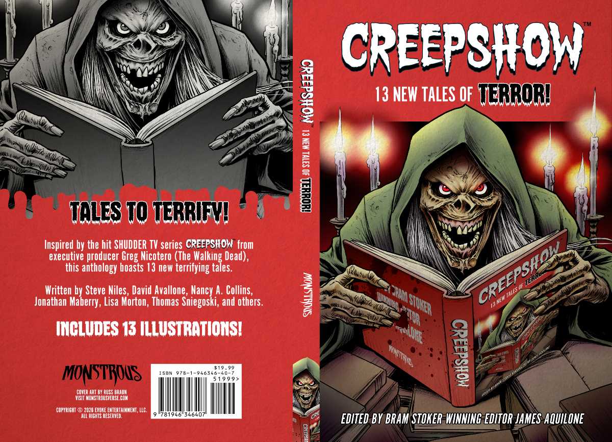 Monstrous and Evoke Entertainment Unveil The First-Ever Creepshow™ Prose Collection Inspired by the Hit Shudder Series: "With its cutting-edge blend of horror and humor George A. Romero and Stephen King’s 1982 film Creepshow™ inspired generations of fans and launched a beloved horror franchise. Prolific special effects artist, director, and producer Greg Nicotero (Walking Dead) introduced a new generation of fans to Creepshow™ with the acclaimed 2018 Shudder TV Series. And next year, in May 2026, Bram Stoker Award-winning editor and writer James Aquilone’s Monstrous Books is launching Creepshow: 13 Tales of Terror, the first-ever short story collection inspired by the acclaimed series.