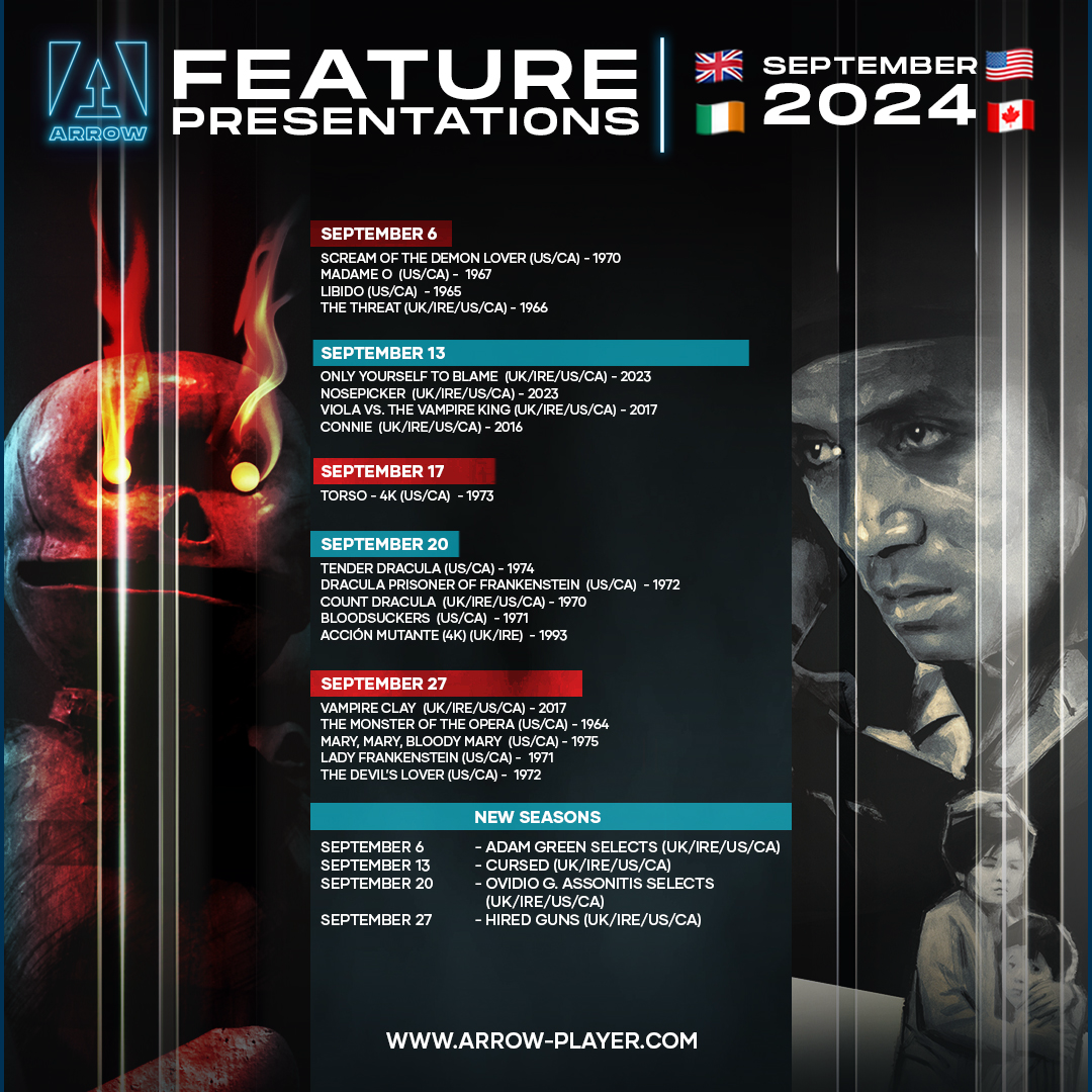 Streaming September 2024: ARROW's September SVOD Lineup Announced: "Arrow Video is excited to announce the September 2024 lineup of their subscription-based ARROW platform, available to subscribers in the US, Canada, the UK and Ireland. Enjoy a selection of new titles, from carefully cultivated curations to shorts by new talent to deep dives into the tastes of filmmakers that changed the way we see the genre.