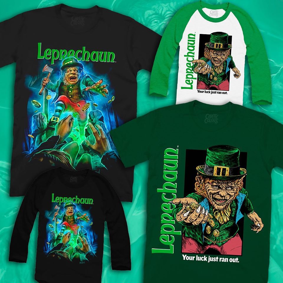 Cavitycolors' New Leprechaun Apparel Release Details: "AVAILABLE NOW! Our licensed LEPRECHAUN collection includes exclusive new black tees, dark-green ‘90s horror-inspired shirts, and green-sleeve raglans!