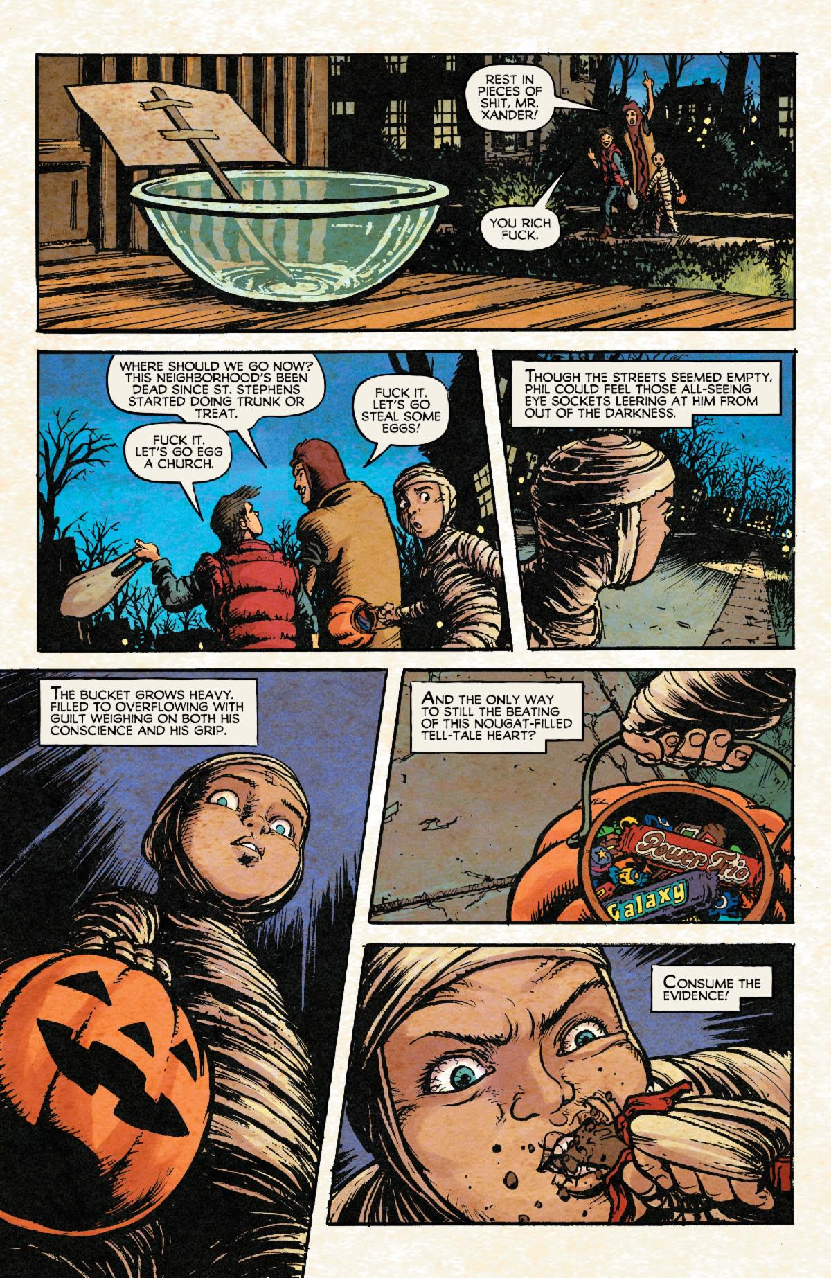All-star writer/artist Chris Burnham (Die! Die! Die!) kicks off the debit issue with a terrifying tale of trick or treaters who are taught what happens when you mess with the wrong house.