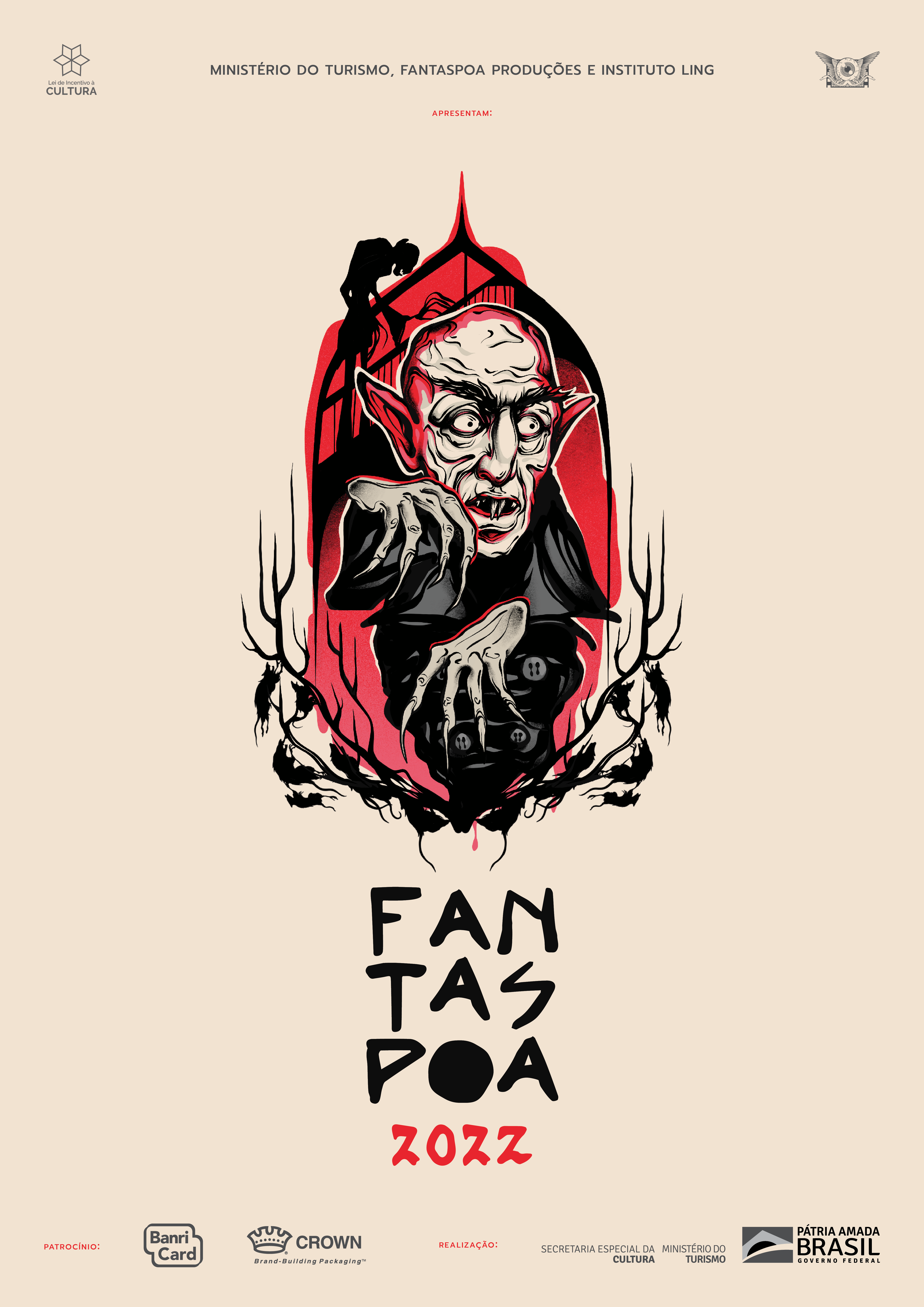 The poster for this year’s festival was conceived by the festival’s art director Thalles Mourão, with the drawing from local artist Fernanda Moreira. The striking image is a mashup of two centenary anniversaries: The Modern Art Week, one of Brazil’s greatest art movements, and F. W. Murnau’s 1922 masterpiece of cinema, NOSFERATU: A SYMPHONY OF HORROR.