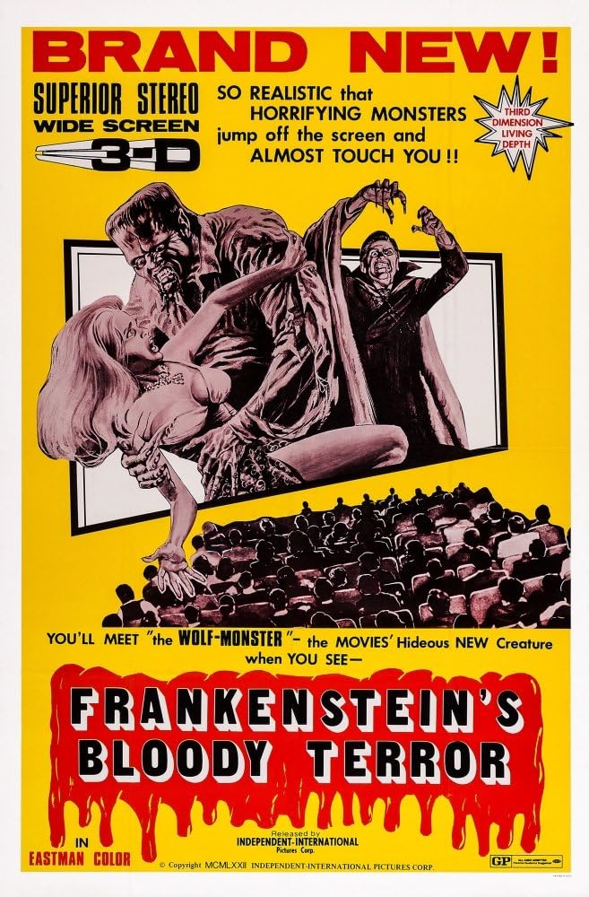 Independent-International also brought many European genre films to the U.S., including the Italian giallo classic ALL THE COLORS OF THE DARK (1972), starring Edwige Fenech and directed by Sergio Martino, the horrific German krimi CREATURE WITH THE BLUE HAND (1967), starring Klaus Kinski, and FRANKENSTEIN'S BLOODY TERROR (1971), the 3-D monster mash that introduced Spanish horror star Paul Naschy.