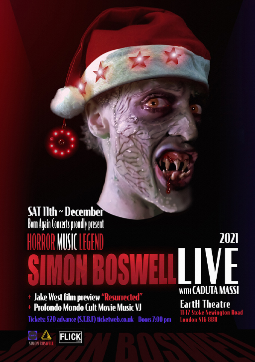 Simon Boswell and Caduta Massi will perform at EartH Theatre, 11-17 Stoke Newington Road. London N16 8BH on Saturday 11th December 2021. Doors open at 7pm. Profondo Mondo will play Cult movie music, euro horror and synthwave mixes, complete with live VJ cult visuals. Tickets: £20 advance (S.T.B.F.)
