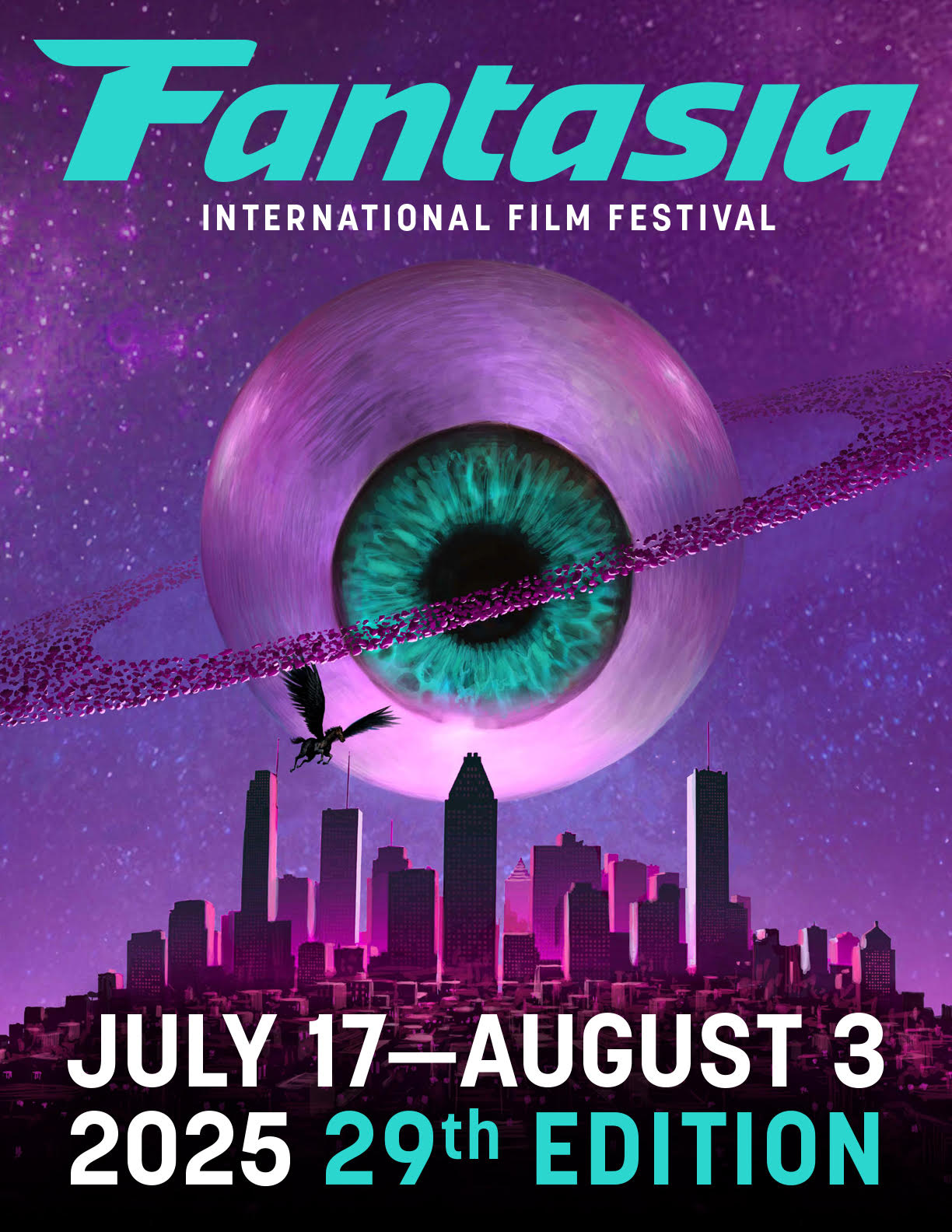 Fantasia International Film Festival 2025 Poster Revealed: The festival’s 2025 poster art was created by visual artist Donald Caron, featuring "an enormous all-seeing eye staring down over Montreal, with Fantasia's iconic Cheval Noir soaring triumphantly across its skyline."