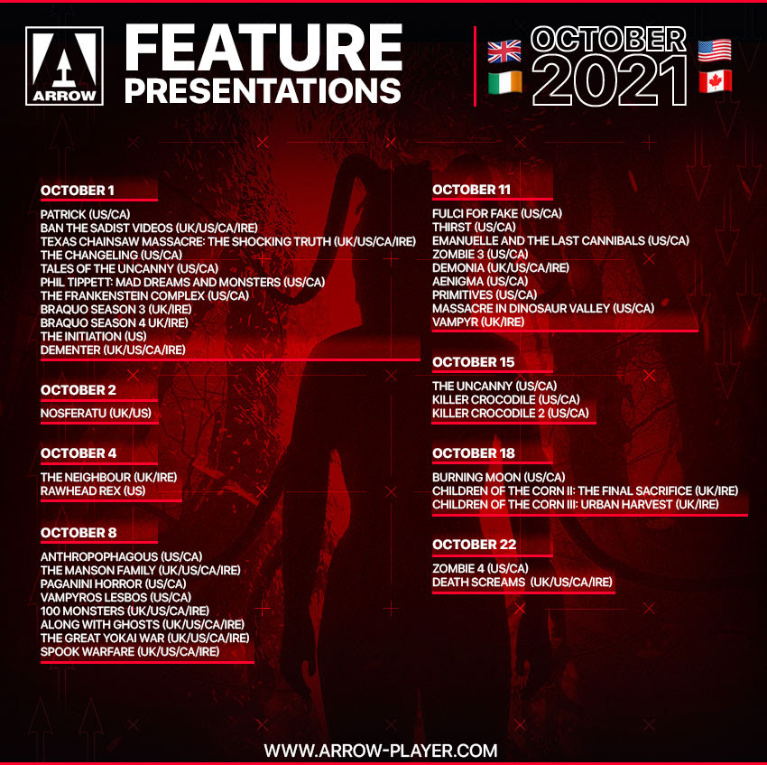 ARROW Announces October SVOD Lineup, Leading With Micro-Budget Horror DEMENTER & TEXAS CHAINSAW MASSACRE: THE SHOCKING TRUTH: "London, UK - Arrow Video is excited to announce the October 2021 lineup of their new subscription-based ARROW platform, available to subscribers in the US, Canada, the UK and Ireland.