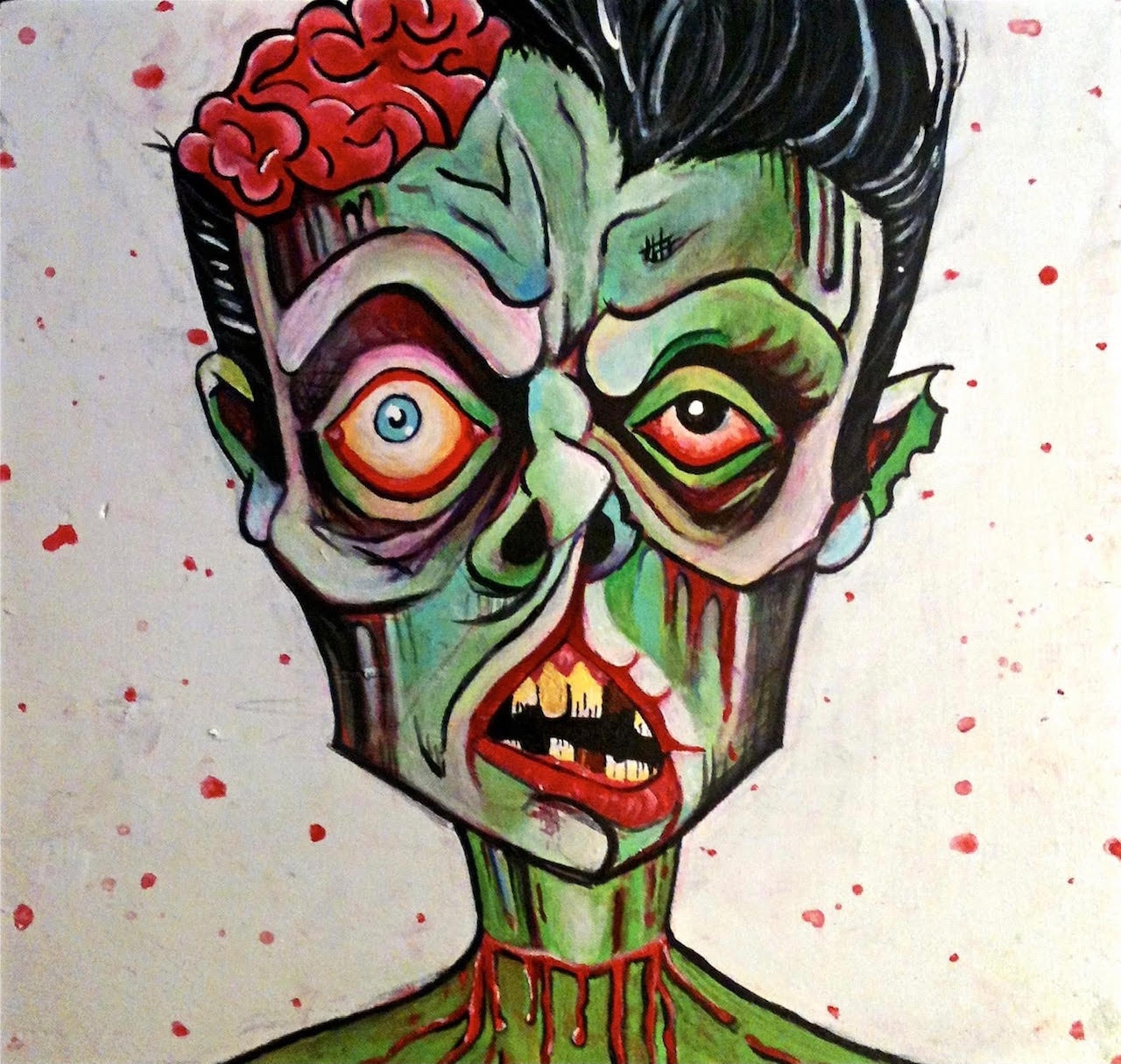 Jennifer Brackett Le Roy Art: "Jennifer Brackett Le Roy is a formally trained artist that is constantly pushing the boundaries of her training and talent. She graduated from the prestigious School of the Art Institute of Chicago and had a residency at The Slade in London. Since then she has exhibited and sold her art at several shows in cities such as Los Angeles, New York, Chicago, London and Austin. She is well versed in many mediums and after graduating from The School of the Art Institute of Chicago, Jennifer added Spraypaint to her arsenal of artistic tools. Her main focus is the human face, producing zombie-like creatures that express a multitude of emotions, from dead pompadoured greasers brandishing punk rock sneers on giant spraypainted boards, to hot rockabilly girls expressing despair and longing. What comes across in her art are original interpretations of her many eclectic influences, giving a new visual representation to such things as rockabilly and gory horror movies. Recently, she started making zombie portraits where she turns you or a loved one into a zombie!