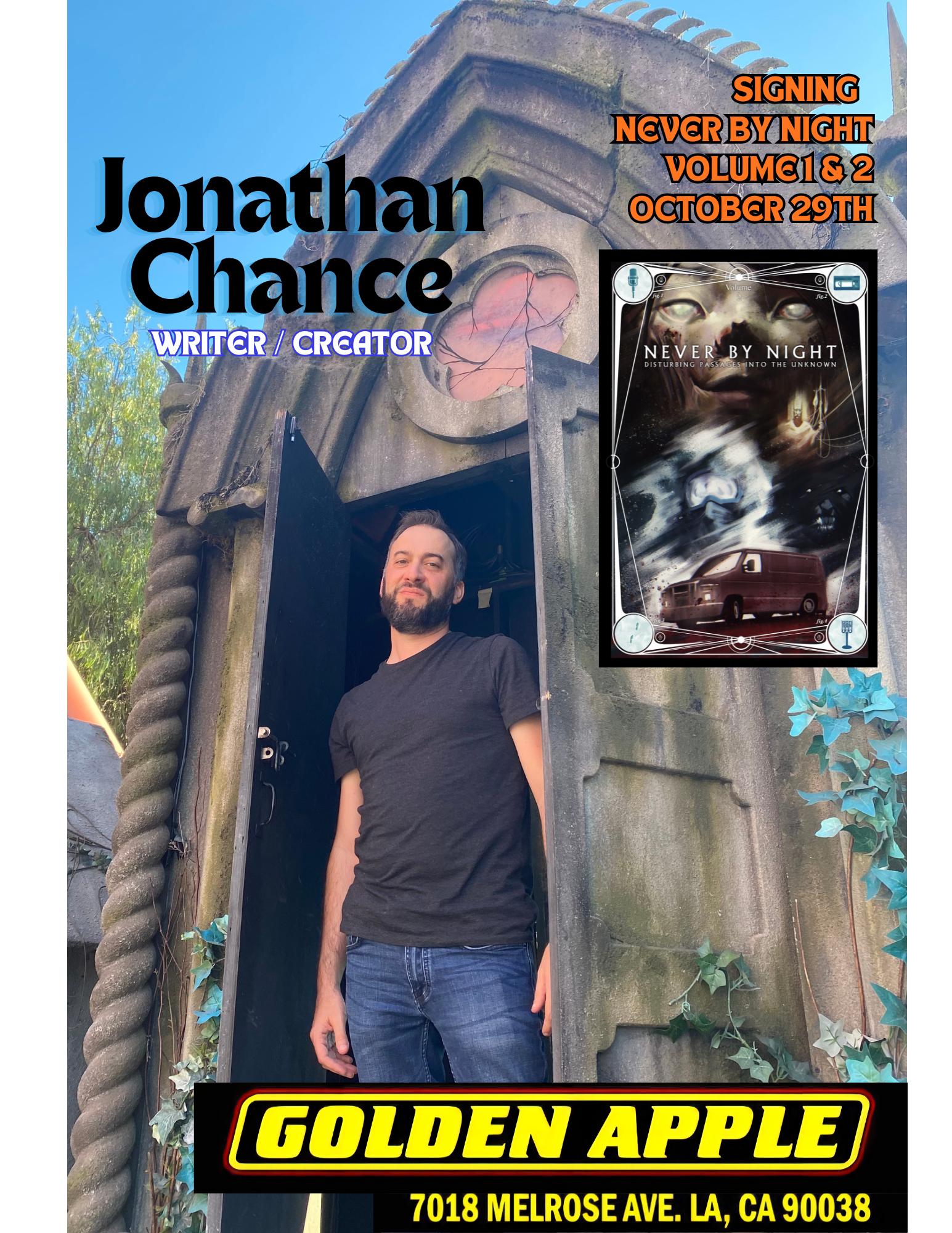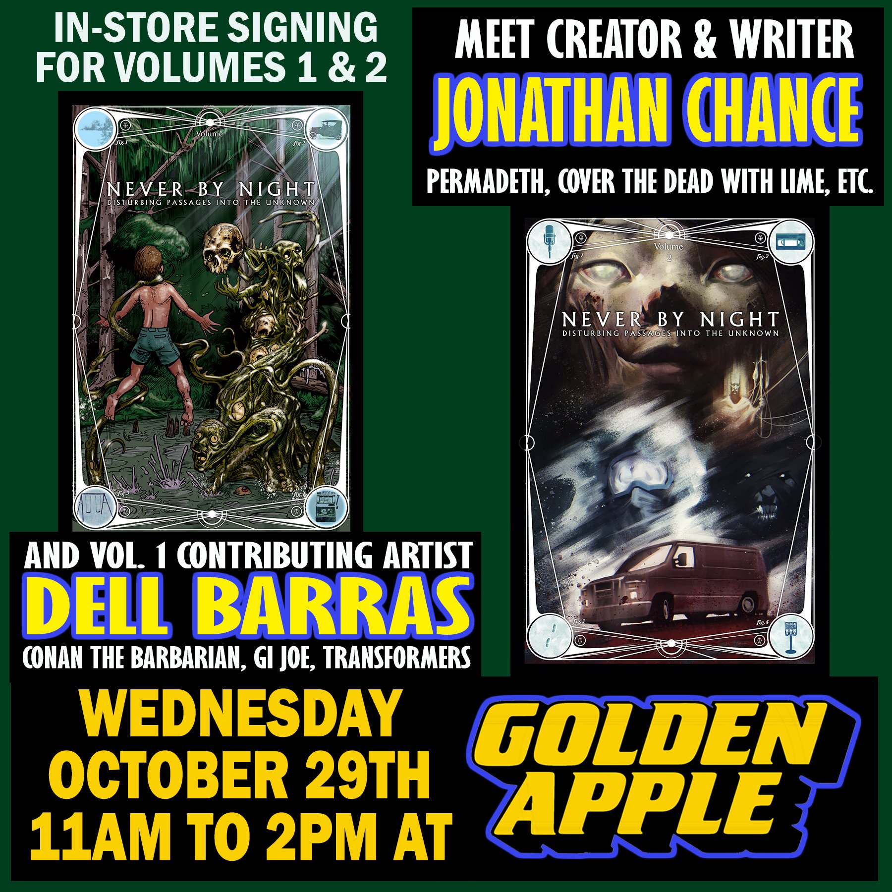 Never By Night Volume 2 released earlier this month and Jonathan Chance will be signing tomorrow at Wednesday, October 29th New Comic Day at the world famous Golden Apple to promote volumes 1 and 2 along with some other horror goodies like Never By Night tees, autographed cards and more tales of terror on the table ...oh, and did I mention legendary illustrator and storyboard artist Dell Barras (Conan the Barbarian, Fright Night, Blue Beetle) as the contributing illustrator will be there too?