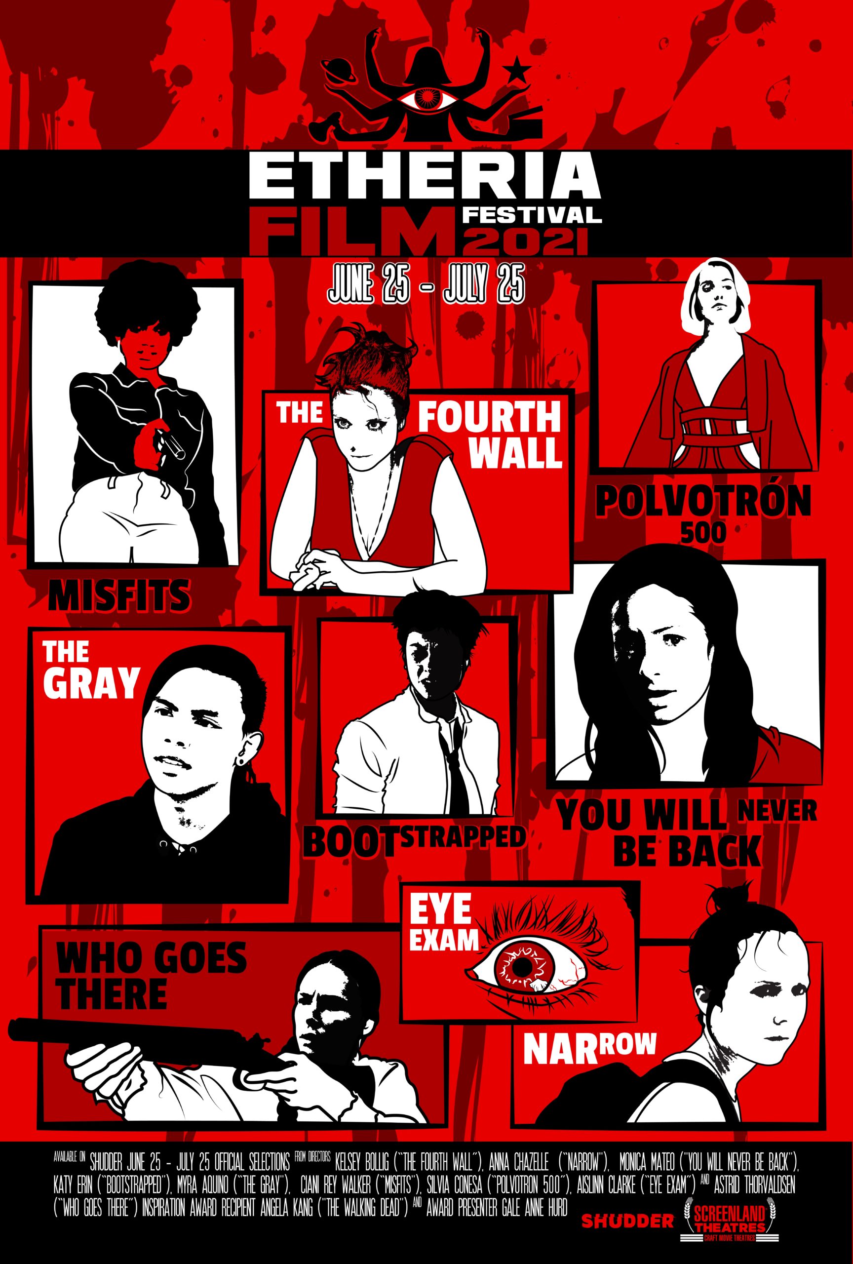 The 2021 Etheria Film Festival short film lineup includes the frenetic grand-Guignol horror The Fourth Wall from director Kelsey Bollig, the nail-biting sci-fi thriller Narrow directed by Anna Chazelle, the sci-fi time-travel comedy Bootstrapped from director Katy Erin, the deeply unsettling Spanish cosmic horror You Will Never Return by Mónica Mateo, the perfectly-paced comedy/fantasy The Gray from Myra Aquino, the new period thriller Misfits from director Ciani Rey Walker, the Philip K. Dick-style A.I. encounter Polvotrón 500 from Spanish director Silvia Conesa, the creepy, Gilliam-esque Eye Exam from acclaimed Irish director Aislinn Clarke, and the shockingly bleak and terrifying period horror western Who Goes There from Norwegian/U.K. director Astrid Thorvaldson.