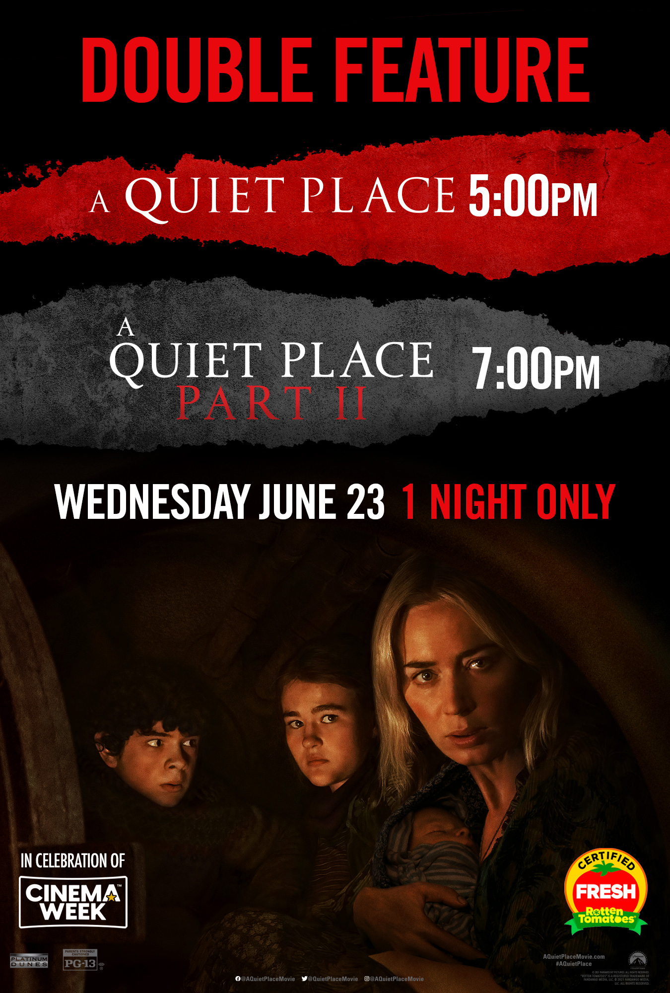 PARAMOUNT PICTURES ANNOUNCES A QUIET PLACE DOUBLE FEATURE FAN EVENT: "Paramount Pictures today announced that on Wednesday, June 23rd, 2021, it will be offering fans of A QUIET PLACE a one-night-only double feature, offering two movies for the price of one regular standard movie ticket. This Double Feature is a chance to relive the original film in select theatres and experience the latest installment, the critically-acclaimed box office hit A QUIET PLACE PART II, in conjunction with the first-ever Cinema Week. Additionally, there will be a special introduction by writer, director and star John Krasinski before the start of the first film.