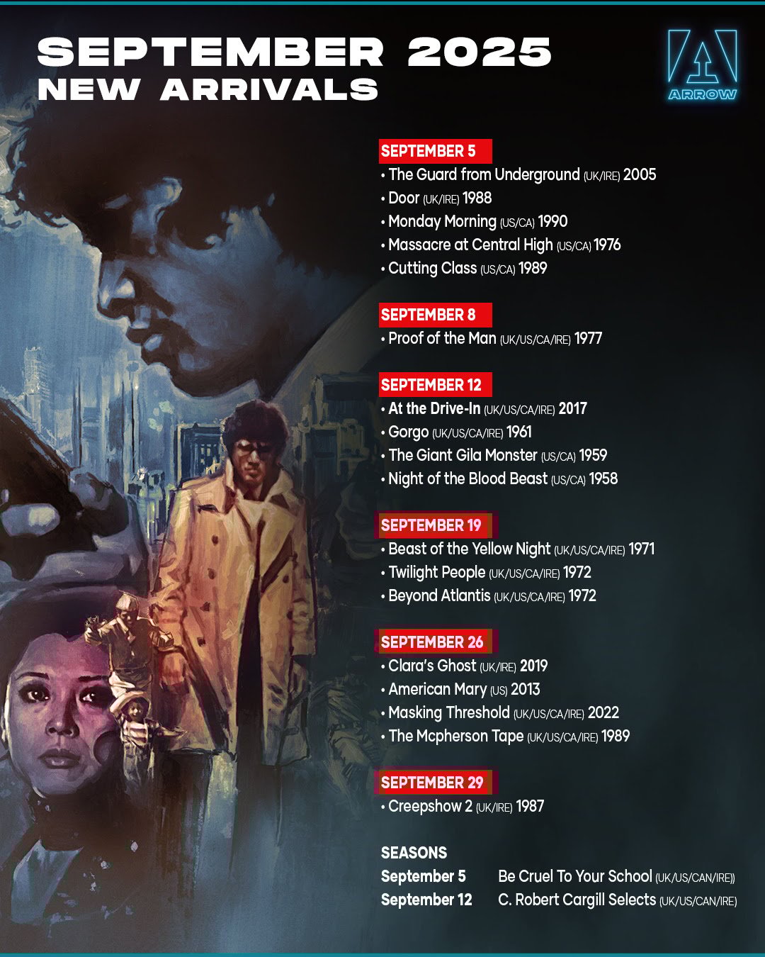 ARROW's September SVOD Lineup Celebrates the Last Days of Summer with Drive-Ins and Back to School Mayhem: "Arrow Video is excited to announce the September 2025 lineup of their subscription-based ARROW platform, available to subscribers in the US, Canada, the UK and Ireland. Enjoy a selection of new titles from carefully cultivated curations to rediscovered classics. For serious enthusiasts, ARROW offers deep dives into the tastes of filmmakers that changed the way we see the genre.