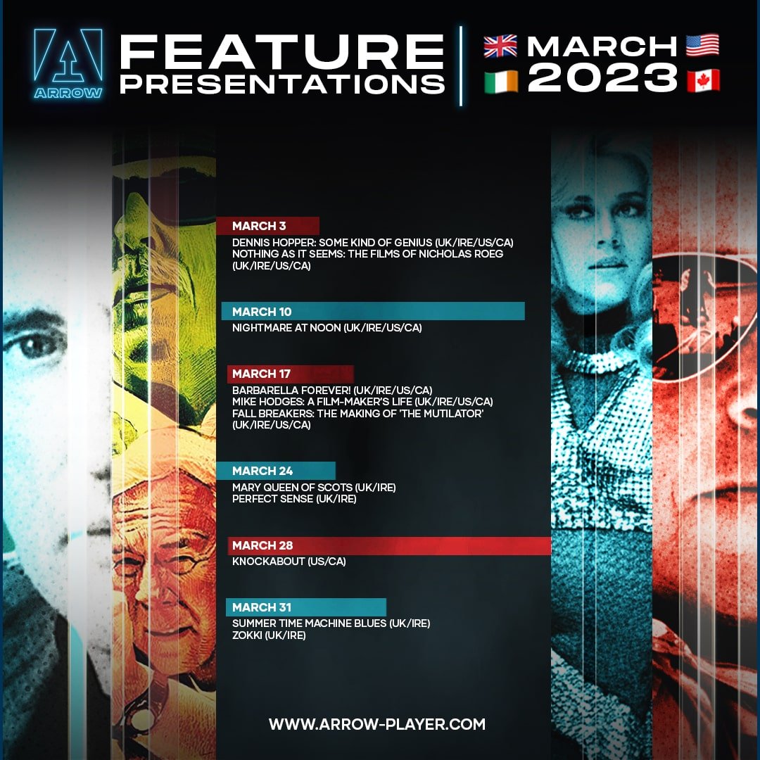 ARROW Announces March 2023 SVOD Lineup: "In March ARROW are proud to take subscribers into a deep dive into the work of some of cinema's most eclectic and exciting filmmakers, including Dennis Hopper, Nicolas Roeg, Mike Hodges, Jeffrey Combs and more.