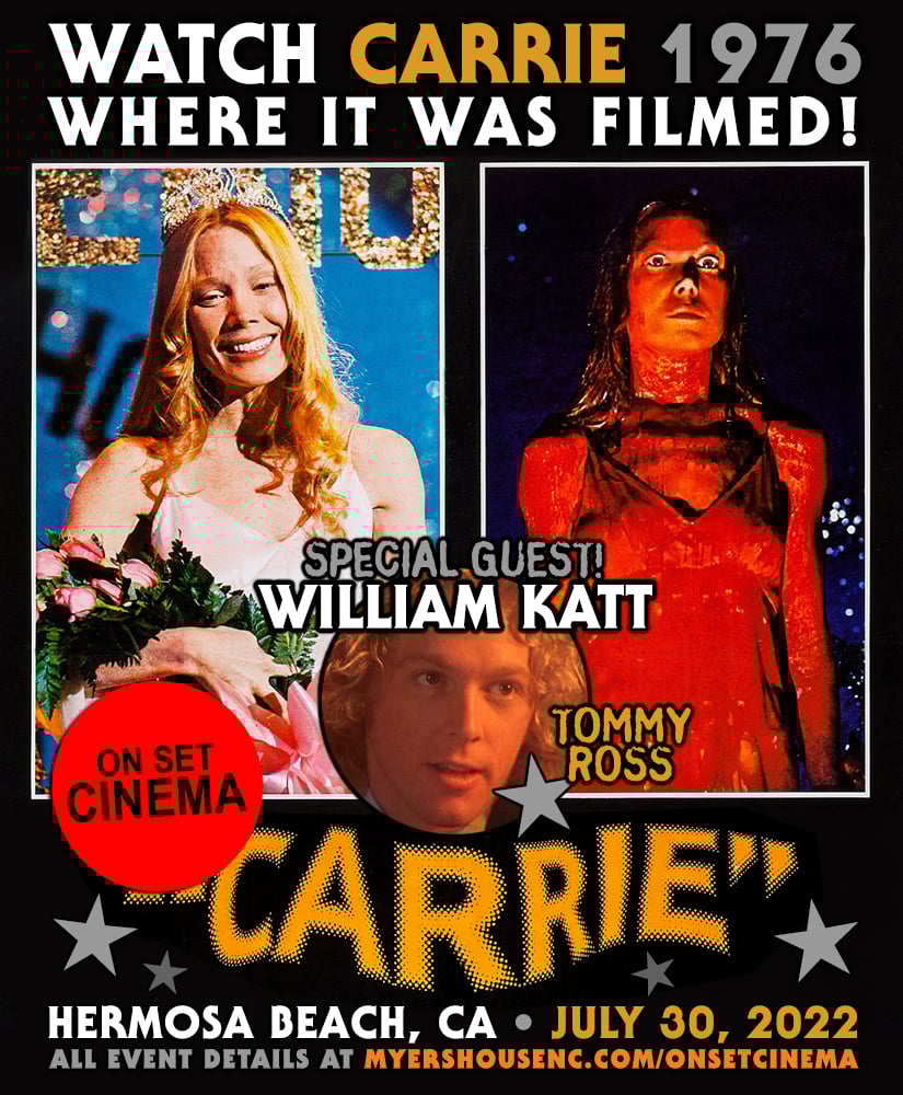 On Set Cinema invites you to Bates High School senior prom! Cover up those dirty pillows and head to Hermosa Beach, California on Saturday, July 30, 2022 for a very special screening event of "CARRIE" (1976) with special guest William Katt (aka Tommy Ross).