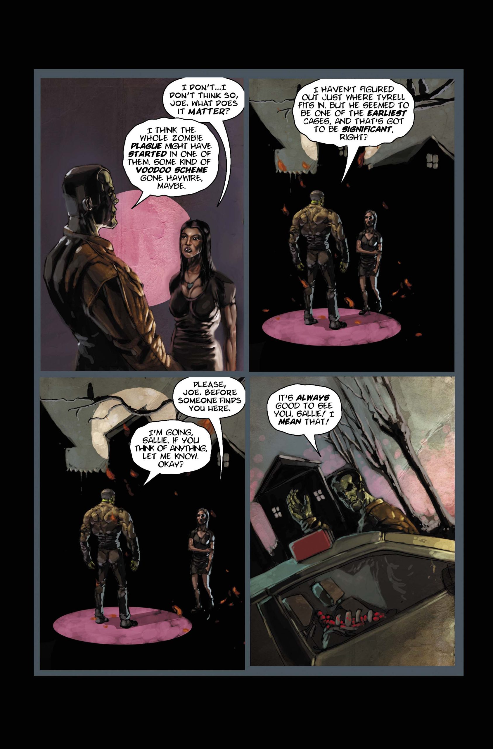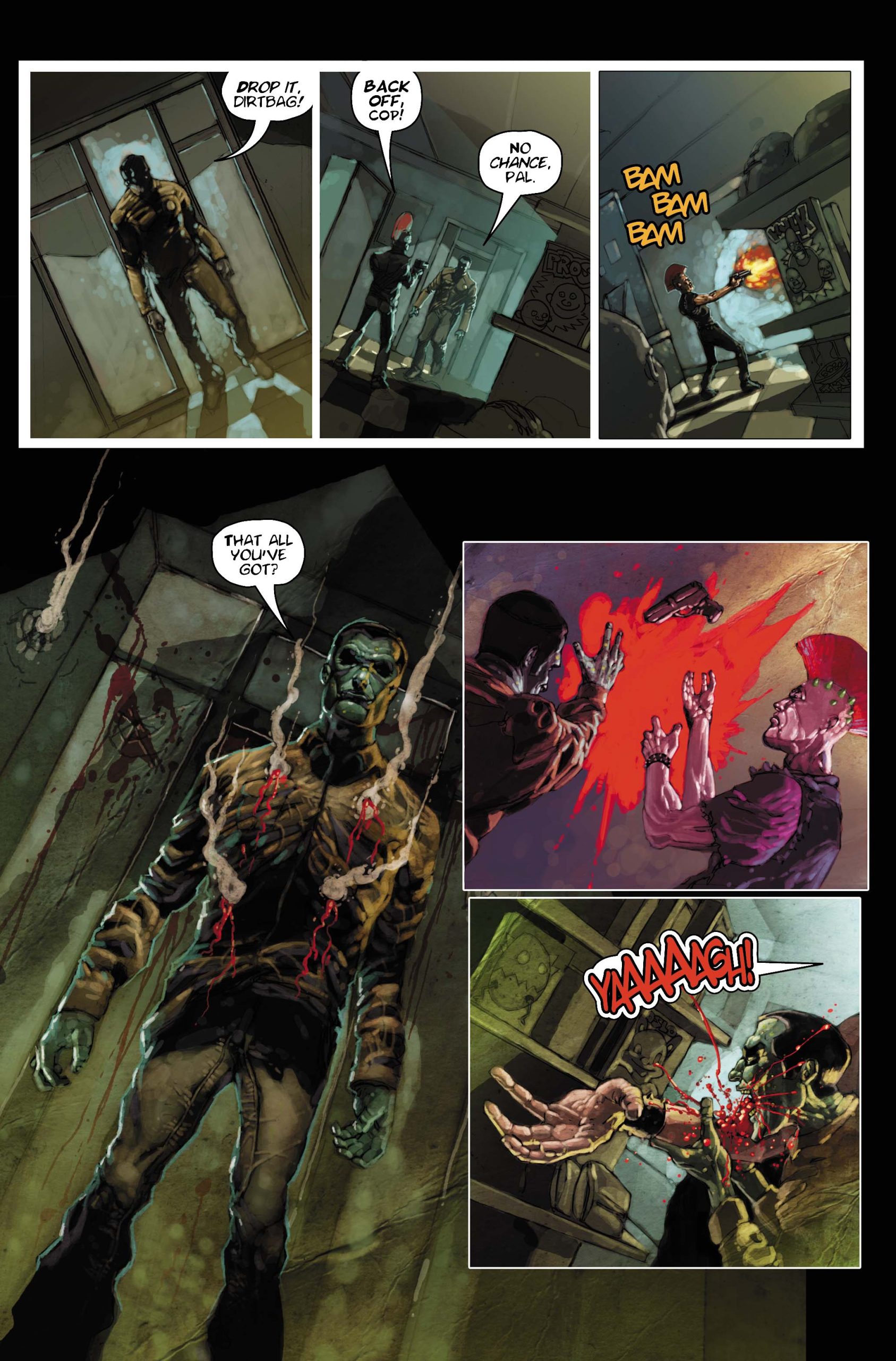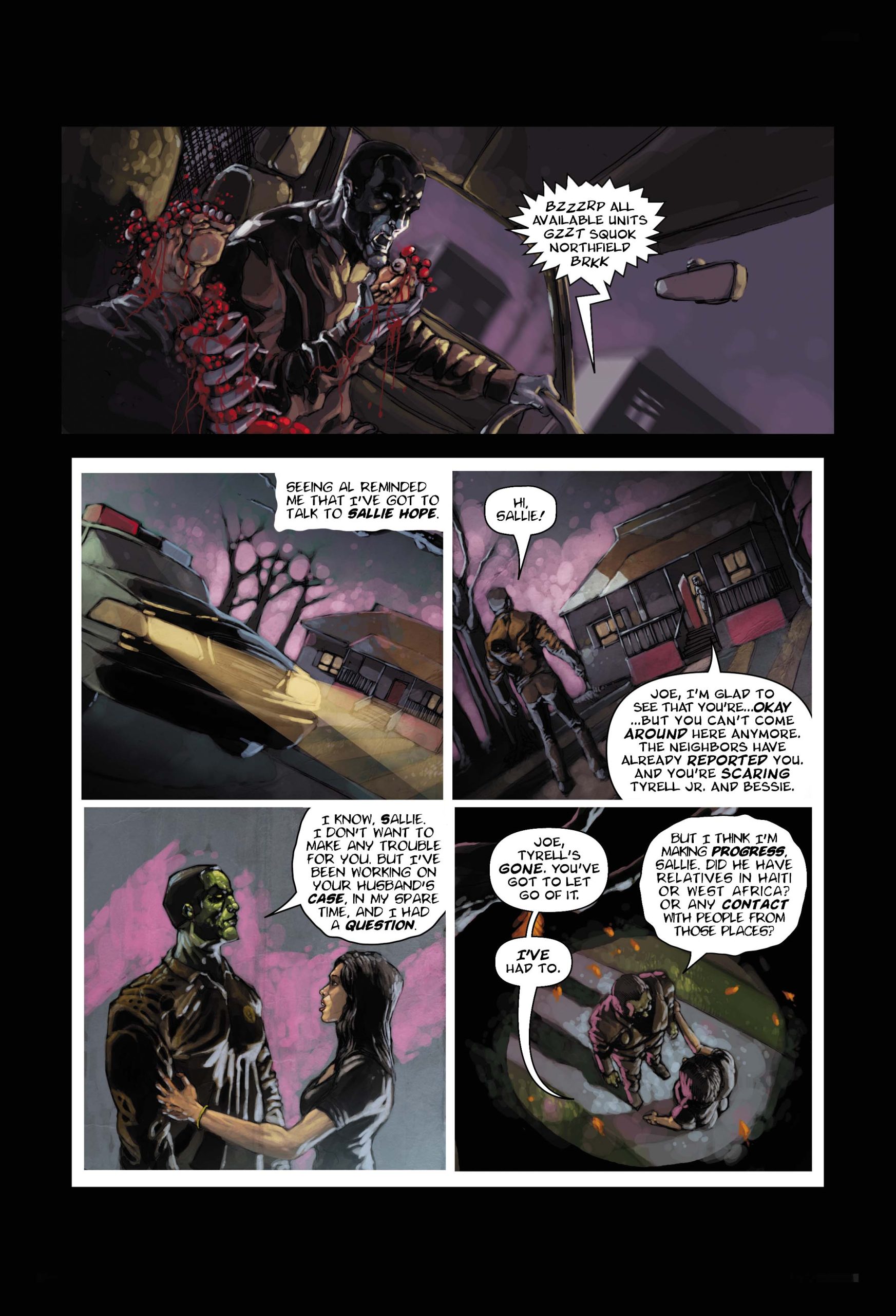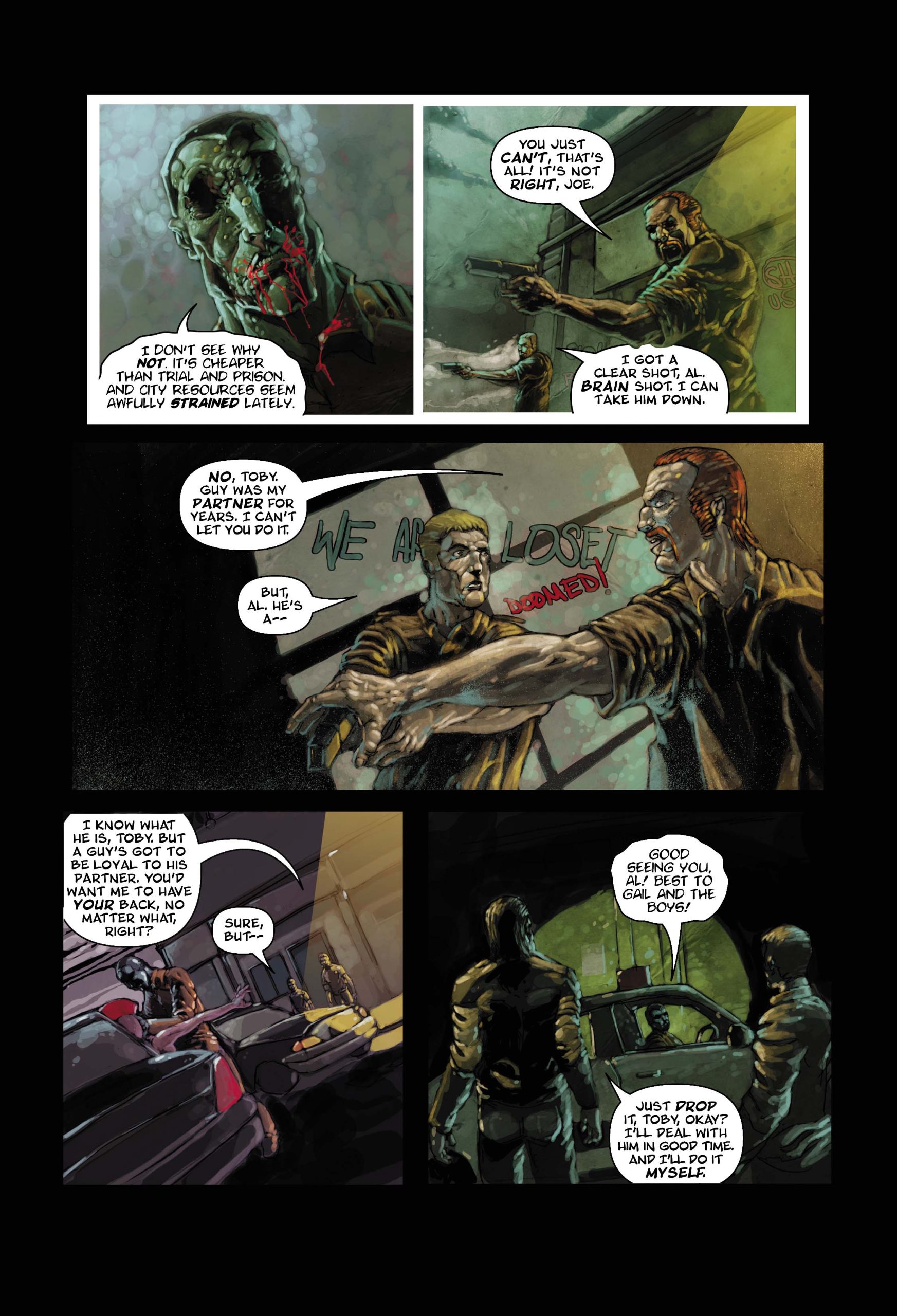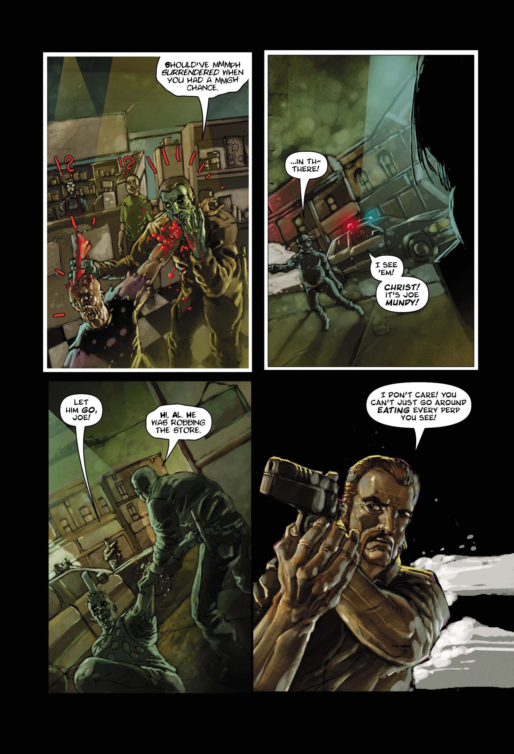 ZOMBIE COP Preview: "Police officer Joe Mundy is a driven man. When he's infected with the zombie virus while searching for a missing man, he realizes his days as a human, possessing all of his mental and physical faculties, are numbered. And when that case connects to the mystery of how the zombie plague started, it becomes that much more important to wrap it up while he still can. The clock is ticking, Joe is losing touch with what makes him human... and the braineaters are on the prowl! Terrifying and tender, humorous and horrific, Zombie Cop is a full-length original graphic novel by award-winning author and write Jeff Mariotte, fully painted by artist Szymon Kudranski."