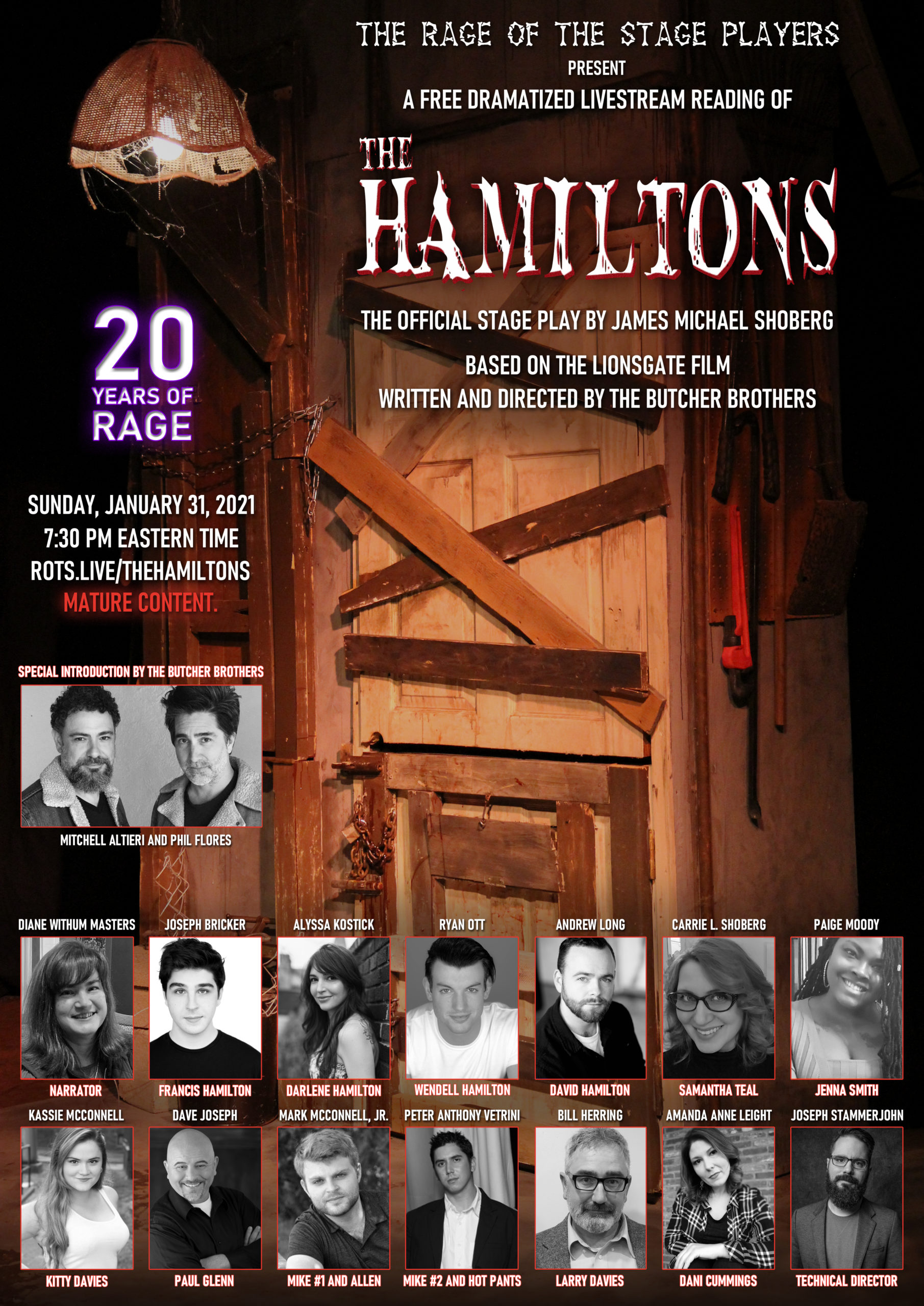 MARK YOUR CALENDARS! The Rage of the Stage Players, Pittsburgh's only dark alternative theatre company, are beginning our 20th anniversary with a FREE dramatized livestream reading of our official stage adaptation of the Lionsgate horror film, The Hamiltons, by The Butcher Brothers!
