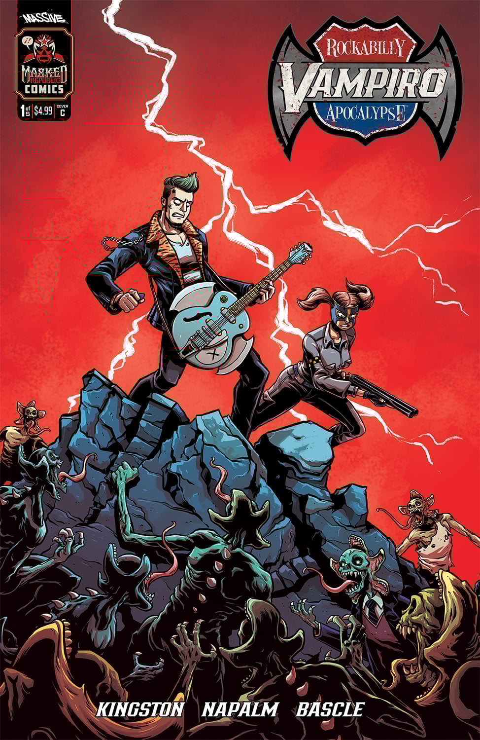 In the pages and panels of Vampiro: Rockabilly Apocalypse, readers will join Vampiro, luchadora Estrella Nocturna, and underground music vlogger Everitt Holden as they hurtle down Route 66 in a 1955 Pontiac Bonneville on a quest to save the world! It’s a tale filled with monsters, muscle cars, luchadores, cops, clowns, nuns, guns, demons, blood and plenty of BBQ as our heroes race against time -and a whole host of enemies - to try and thwart a secret plan to jumpstart the apocalypse!