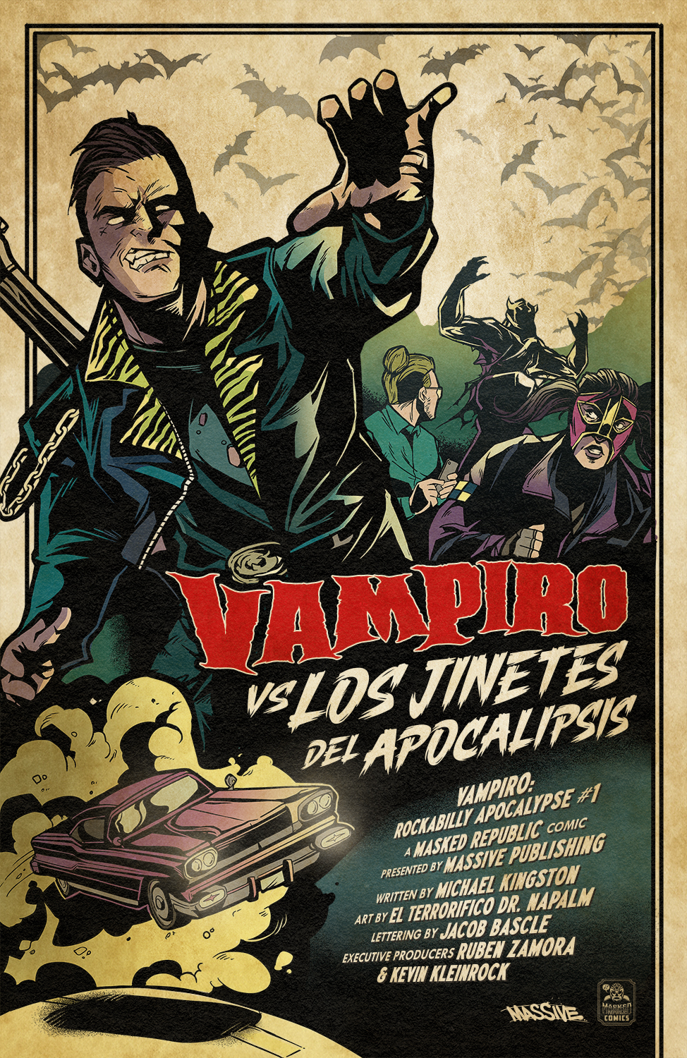 VAMPIRO: ROCKABILLY APOCALYPSE: "Massive Publishing, a leading publisher in the comic book direct market has partnered once again with lucha libre focused live event, merchandise, and media organization Masked Republic on the upcoming project. The two companies recently partnered on the release of another wrestling-inspired series, Luchaverse which featured some of the most iconic luchadors in the business today. Now, with Vampiro: Rockabilly Apocalypse, they are bringing a stylized action filled adventure to die hard horror enthusiasts and the legions of Vampiro fans around the globe. This horrifying first issue is a SUPER SIZED 48-PAGE premiere written by Michael Kingston and is set to release on October 16, 2024 but eager fans don’t have to wait till October to get their first taste of this brand new series. Massive and Masked Republic will have an exclusive ashcan preview available at this year’s San Diego Comic Con (SDCC) available throughout the weekend including a special signing with Vampiro and Kingston on Friday July 26th at booth #1901 from 5pm-6pm!