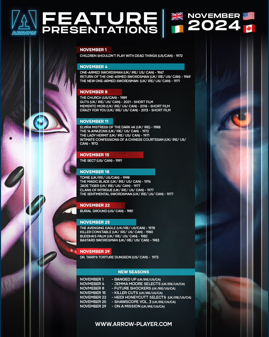 Streaming November 2024: ARROW Announces Streamer Lineup with Shawscope, Shorts & Killer Cuts: "Arrow Video is excited to announce the November 2024 lineup of their subscription-based ARROW platform, available to subscribers in the US, Canada, the UK and Ireland. Enjoy a selection of new titles, from carefully cultivated curations to shorts by new talent. For serious enthusiasts, ARROW offers deep dives into the tastes of filmmakers that changed the way we see the genre.
