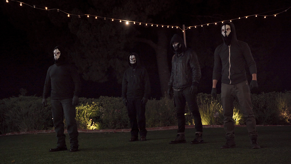 Tensions are running high between Daniel and Jessica. Daniel has found himself in hot water at work with both his boss and investigators breathing down his neck. And now Jessica's little sister, Liz, has shown up unannounced while on the run from her abusive boyfriend. While the feuding parties go to opposite areas of the house, everyone's worst nightmare is forming in the backyard: four masked men have arrived for their "Night of the Locusts". The Locusts' clock has started, and they have 180 minutes in which to have their 'fun'.